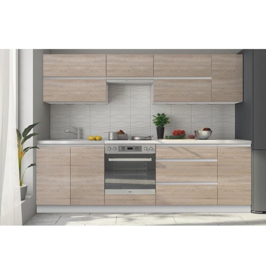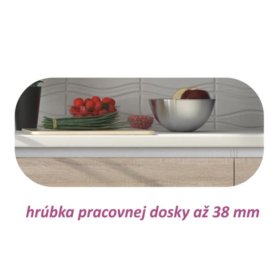 Alapkonyha: a váz DTD laminált sonoma tölgyfa, ajtók - , vagy a váz fehér magasfényű HG DTD laminált fehér/ajtók sonoma tölgyfa. Felső méret a füstelszívó szekrénykével: 2,6 m, alsó méret: 2,6 m,