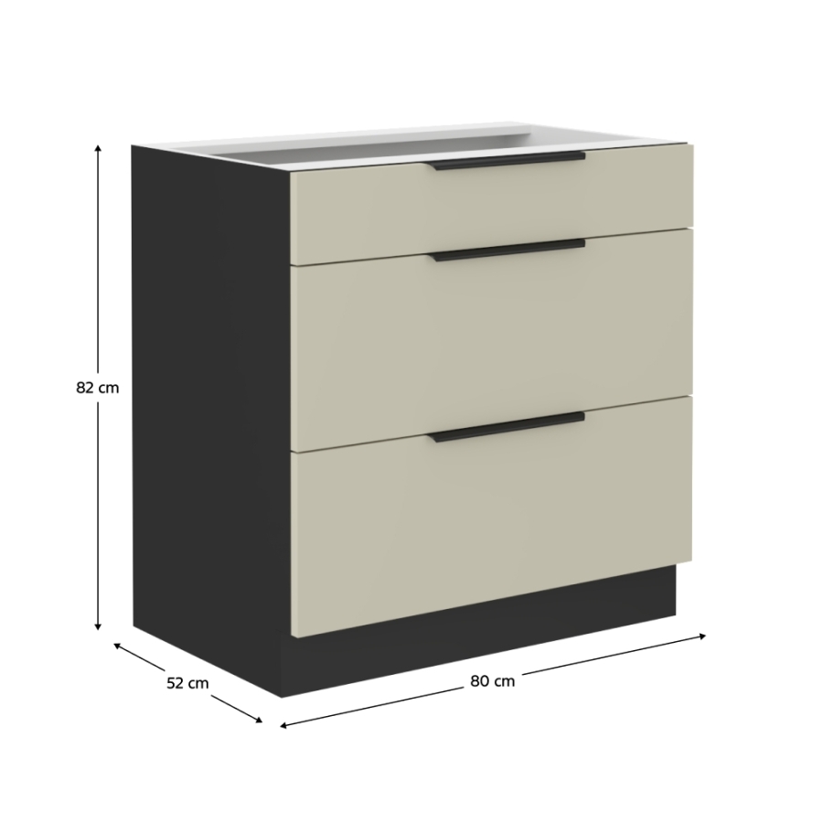Az alsó szekrényeket az alsó sínnel együtt szállítjuk, asztallap nélkül.