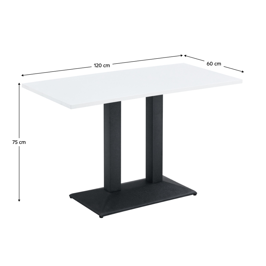 Anyag: laminált DTD/fém Szín: fehér/fekete Méretek (SzxMéxMa): 120x60x75 cm Súly: 21 kg Anyag vastagsága: 2,3 cm Teherbírás: 60 kg Fém alapzat Modern dizájn Asztal típusa: bisztró Szétszerelve szállítva