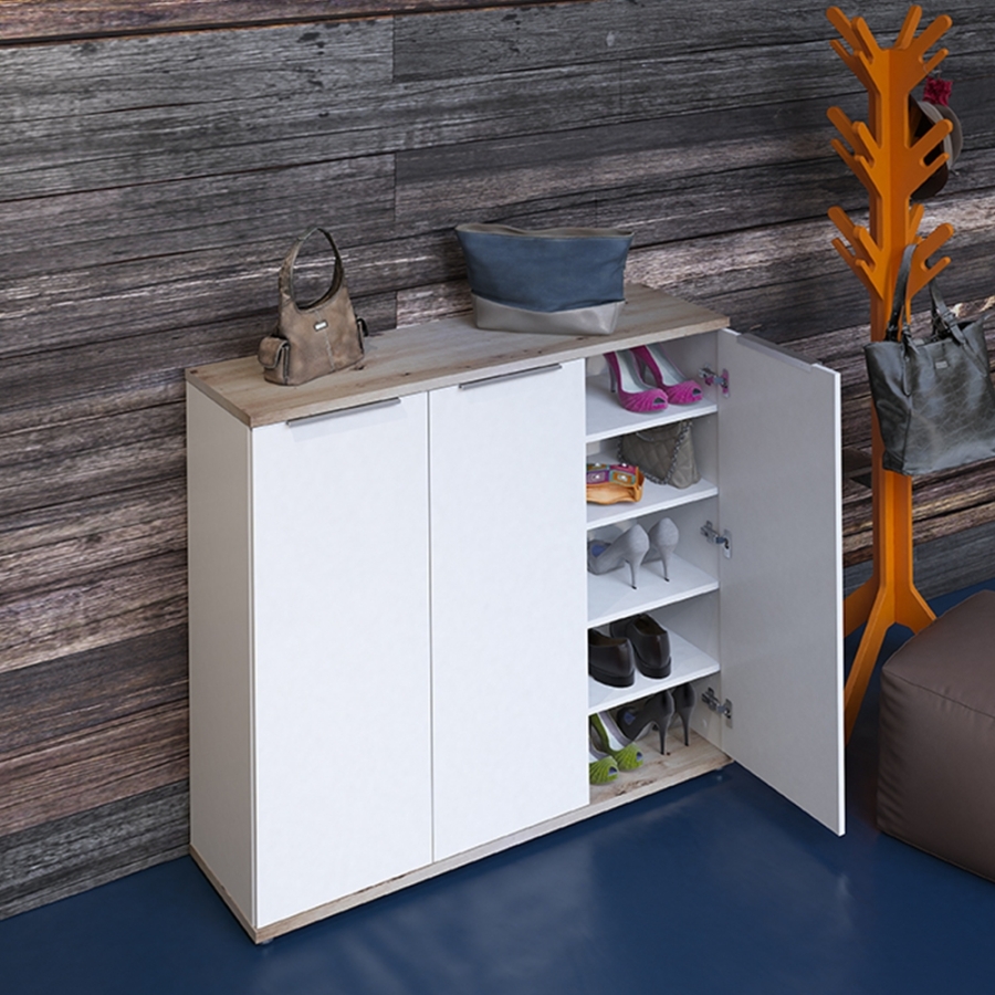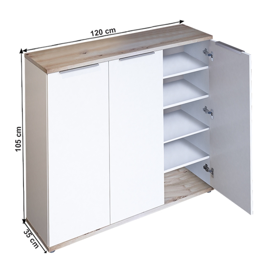 Cipőtartó szekrény, MODINI Typ 2 Anyag: laminált DTD/fém Szín: fehér/tölgy artisan Méretek (SzéxMéxMa): 120x35x105 cm 3 ajtós 3 polcos szekrény Fém fogantyúk Szétszerelve szállítva.