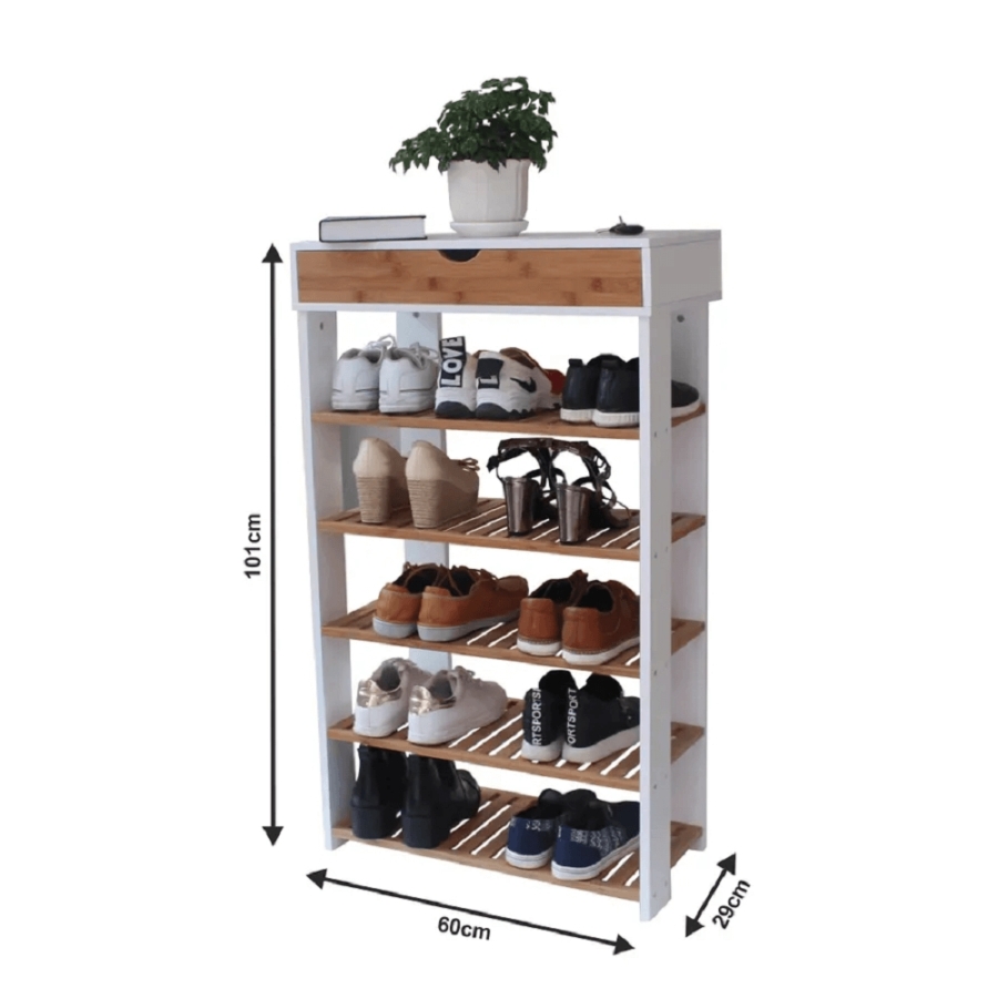 Cipőtartó NUGET TYP 2 Anyag: MDF/fenyőfa Szín: fehér/természetes Méretek (SzxVxH): 60x29x101 cm 5 soros Fiókkal Bontásban szállítva.