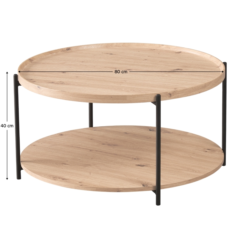 Anyag: MDF/fém Szín: artisan tölgy/fekete Méretek (ÁtmérőxMa): 80x40 cm Teherbírás: 10 kg MDF vastagsága: 1,5 cm Stílusos Kerek Fém lábak Szétszerelve szállítva