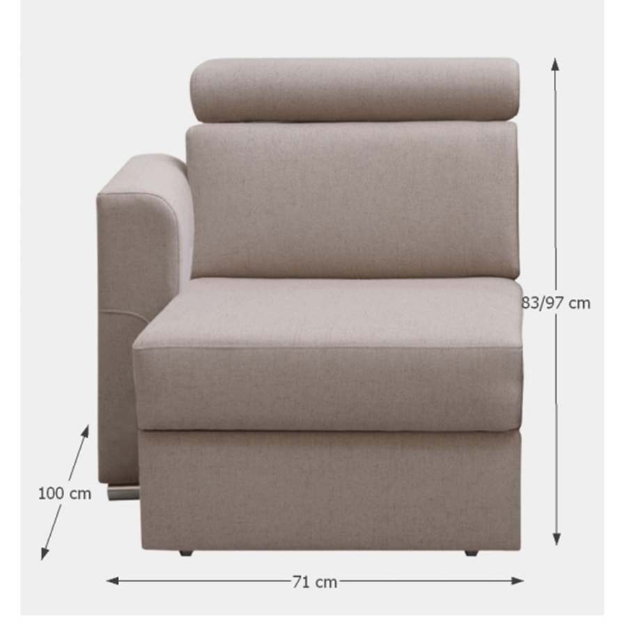 Egyszemélyes ülőrész 1 1B L, MARIETA ülőgarnitúrához, megrendelésre, balos kivitel Méretek: (SzéxMéxMa): 71x100x83/97 cm Az alsó tér magassága a padlótól: 5 cm Terhelhetőség ágyanként: 90 kg Anyag: CABLO A szövet kopásállósága: 72 000 Martindale Szín: bézs Rendelhető 7-féle színváltozatban Cablo szövetből vagy 7-féle színárnyalatban textilbőrből. Egyedi megrendelés esetén szükség van az adott összegnek a 10%-át befizetni,mint előleg. Az előleg befizetése után az Ön követelményét benyújtjuk a gyártónak. Szállítási határidő 8-10 hét.