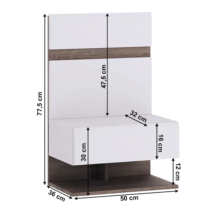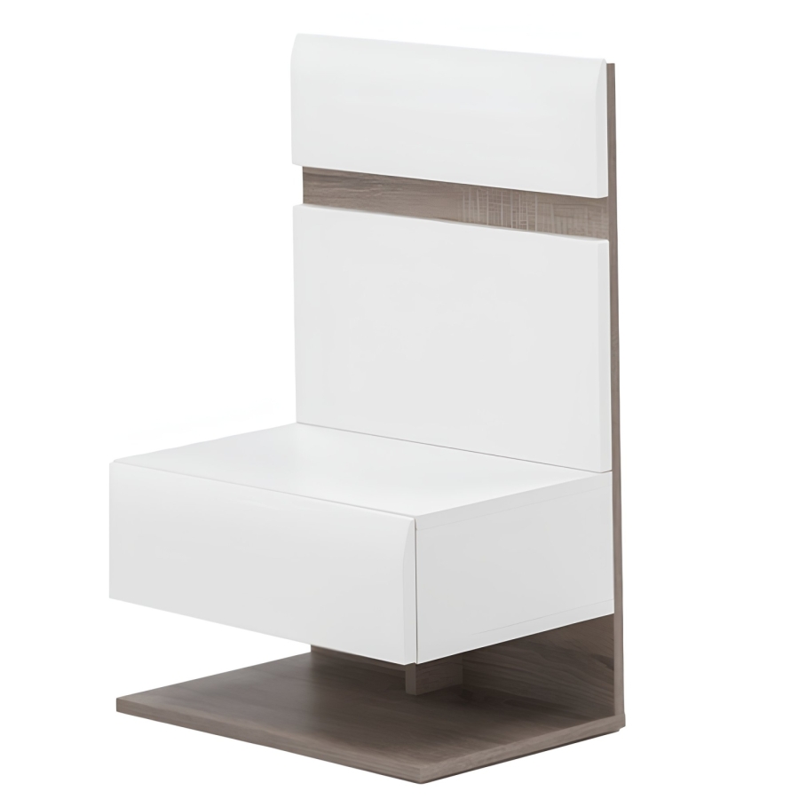 Éjjeliszekrény LYNATET 95 Változat: fehér extra magas fényű HG/ sonoma tölgy trufla Anyag: laminált DTD, ajtók laminált MDF Az Az ajtók modern lekerekített élekkel vannak ellátva Méretek (SzéxMéxMa): 50x36x77,5 cm A váz matt kivitelben kapható Az ajtó extra magas fényű Szétszerelve szállítjuk
