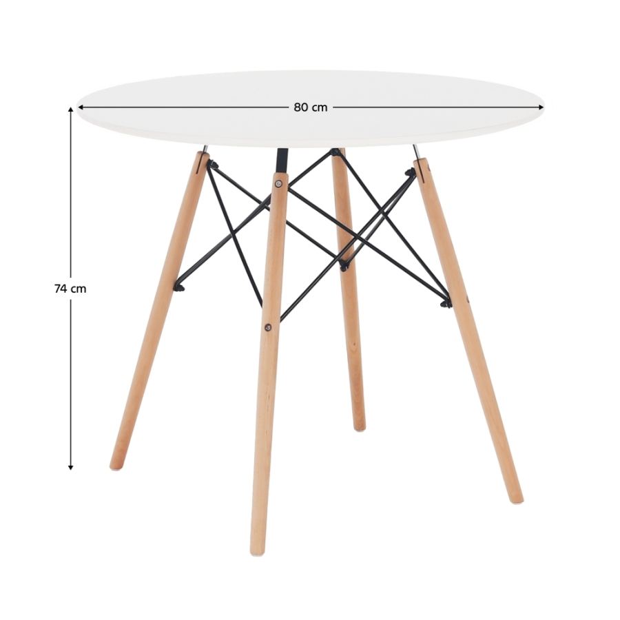 Étkezőasztal Anyag: MDF, fa, fém Színváltozat: fehér/bükk lábak Méretek (átmérő x magasság): 80x74 cm.