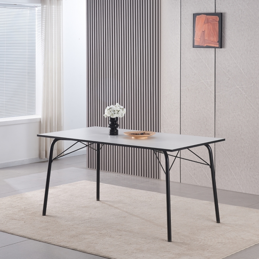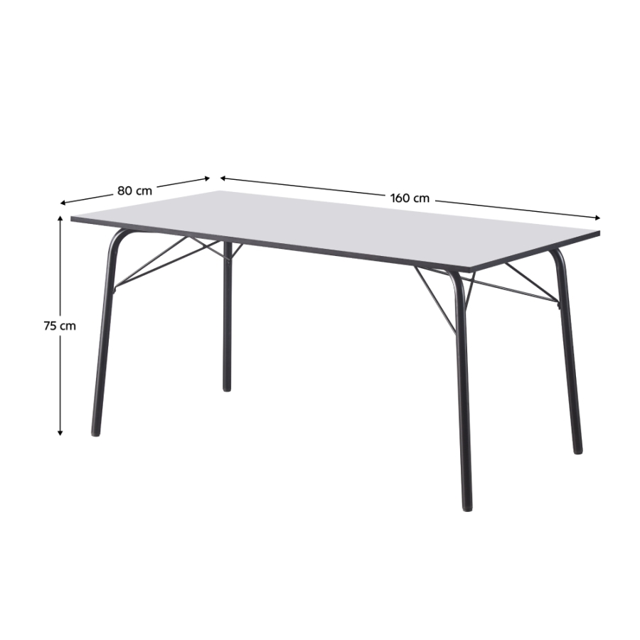 Anyag: MDF/fém Szín: fehér/fekete Méretek (SzxMéxMa): 160x80x75 cm Felső lap anyagvastagsága: 1,8 cm Teherbírás: 25 kg Egyszerű Minimalista Klasszikus kialakítás Fém lábak Egyszerű karbantartás Siklókkal a padló védelmére 8-6 ember számára Szétszerelve szállítva
