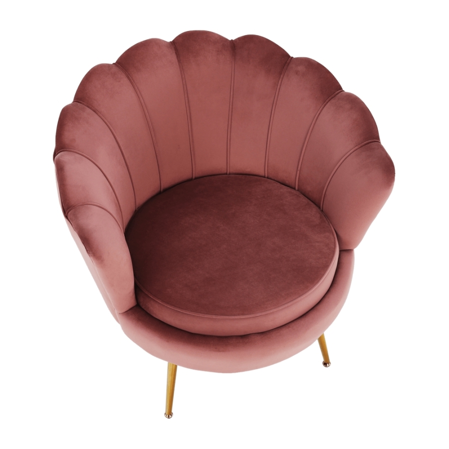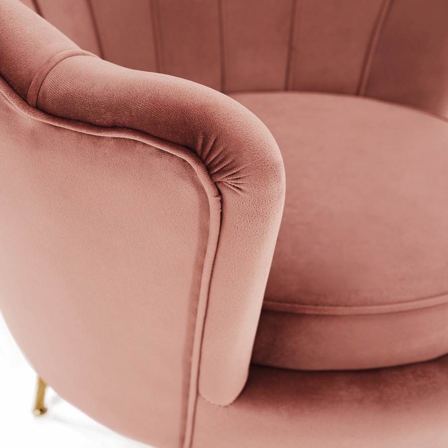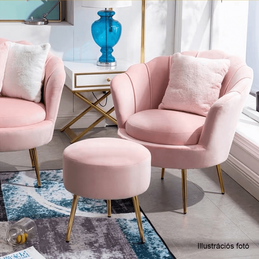 Ülőlap anyaga: Velvet szövet A szövet kopásállósága: 80 000 Martindale Szín: rózsaszín 23 Lábak anyaga: fém Szín: gold króm-arany Méretei (SzéxMéxMa): 77x76x77 cm Ülés magassága: 44 cm Ülés mélysége: 56 cm Teherbírás: 90 kg Dizájnos Art-deco stílus Kagyló alak Modern kidolgozás Bontásban szállítva.
