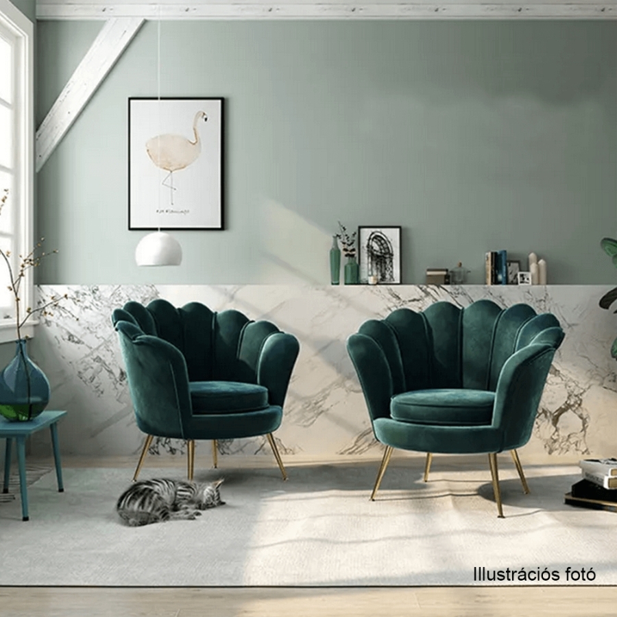 Ülőlap anyaga: Velvet szövet A szövet kopásállósága: 80 000 Martindale Szín: smaragd 18 Lábak anyaga: fém Szín: gold króm-arany Méretei (SzéxMéxMa): 77x76x77 cm Ülés mélysége: 56 cm Ülés magassága: 44 cm Teherbírás: 90 kg Dizájnos Art-deco stílus Kagyló alak Modern kidolgozás Bontásban szállítva.