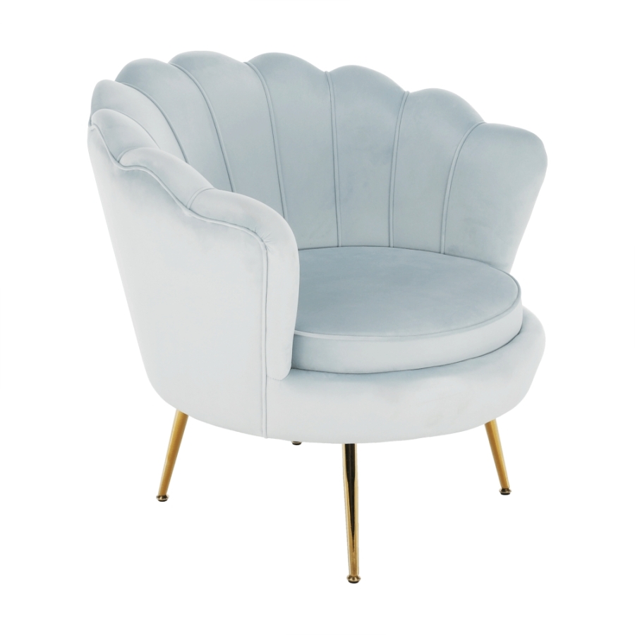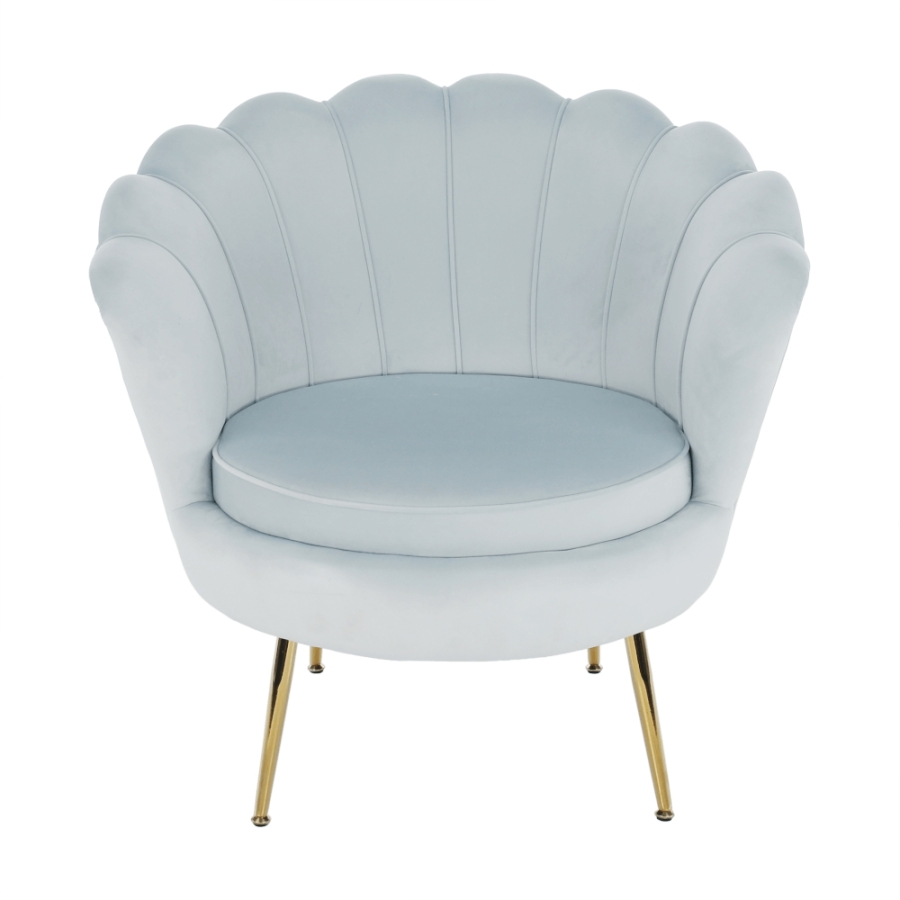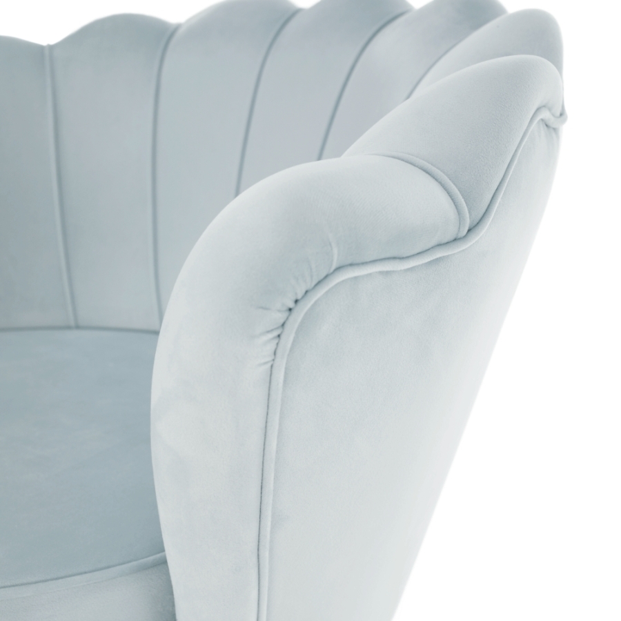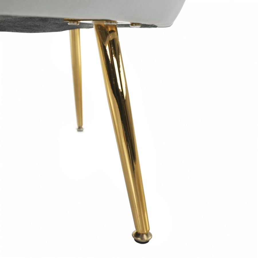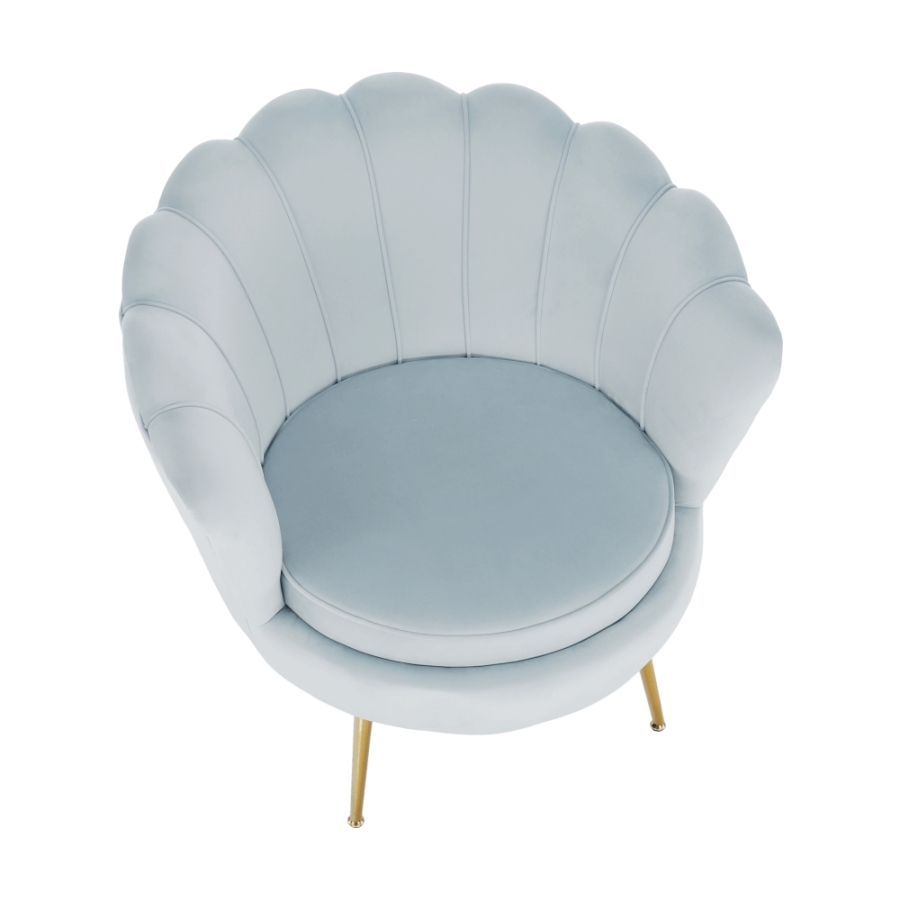 Ülőlap anyaga: anyag Velvet A szövet kopásállósága: 80 000 Martindale Szín: szürke-kék Lábak anyaga: fém Szín: gold króm-arany Méretei (SzéxMéxMa): 77x76x77 cm Ülés magassága: 44 cm Ülés mélysége: 56 cm Terhelhetőség: 90 kg A lábak szintéző lábakkal végződnek,hogy kompenzálja a felületi egyenetlenségeket Dizájnos Art-deco stílus Kagyló alak Modern kidolgozás Bontásban szállítva.