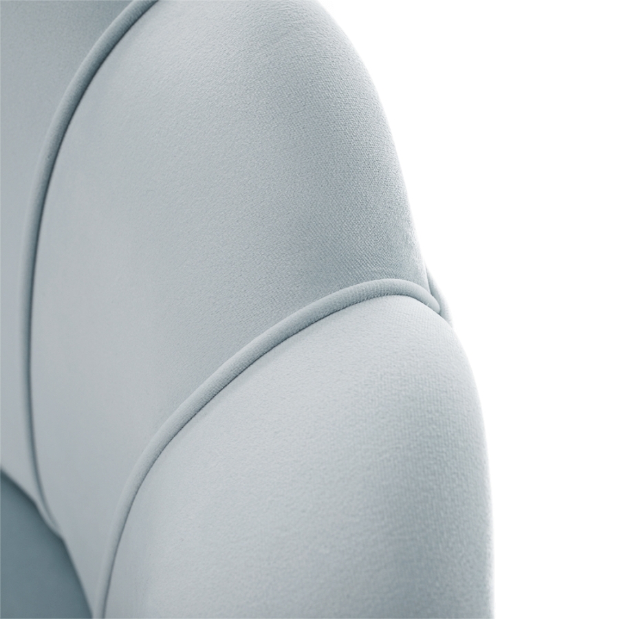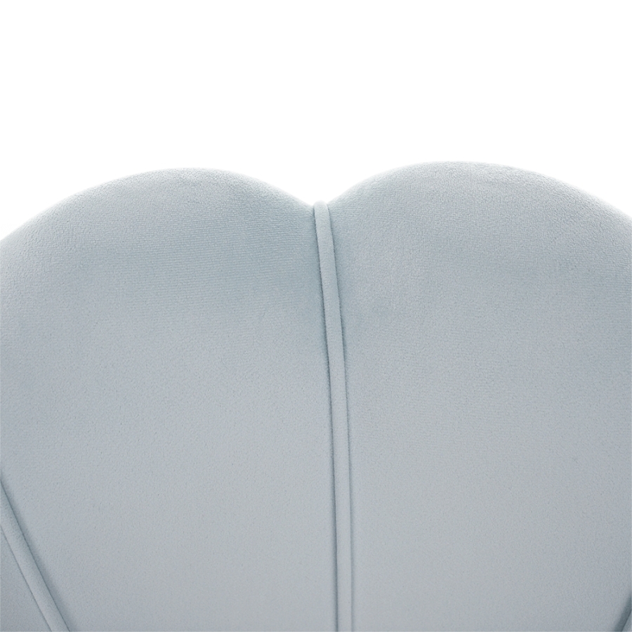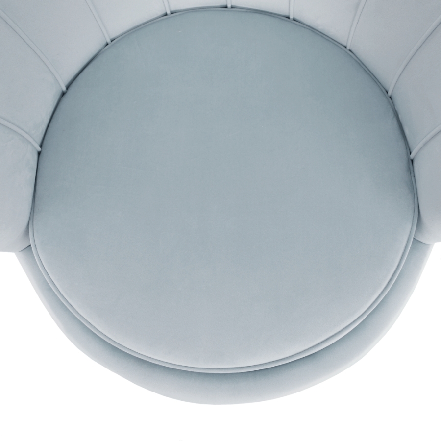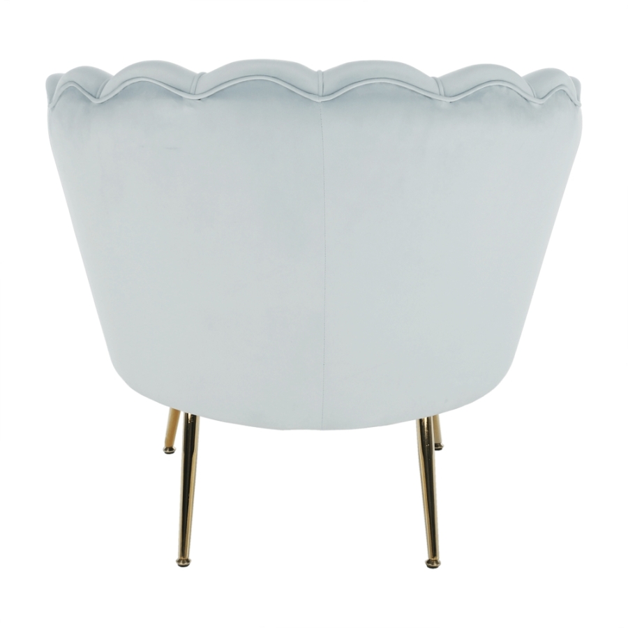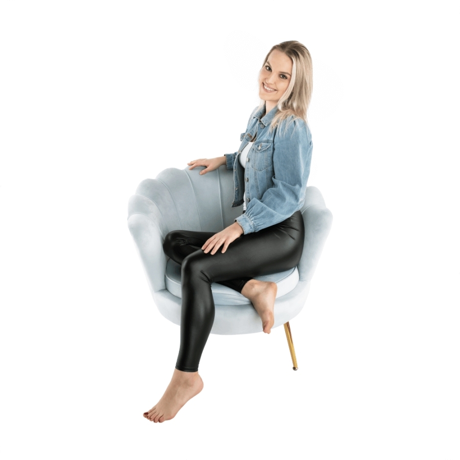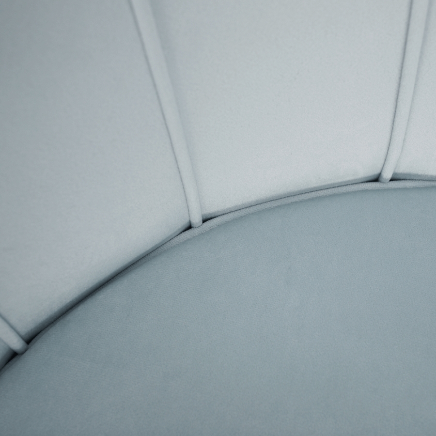 Ülőlap anyaga: anyag Velvet A szövet kopásállósága: 80 000 Martindale Szín: szürke-kék Lábak anyaga: fém Szín: gold króm-arany Méretei (SzéxMéxMa): 77x76x77 cm Ülés magassága: 44 cm Ülés mélysége: 56 cm Terhelhetőség: 90 kg A lábak szintéző lábakkal végződnek,hogy kompenzálja a felületi egyenetlenségeket Dizájnos Art-deco stílus Kagyló alak Modern kidolgozás Bontásban szállítva.