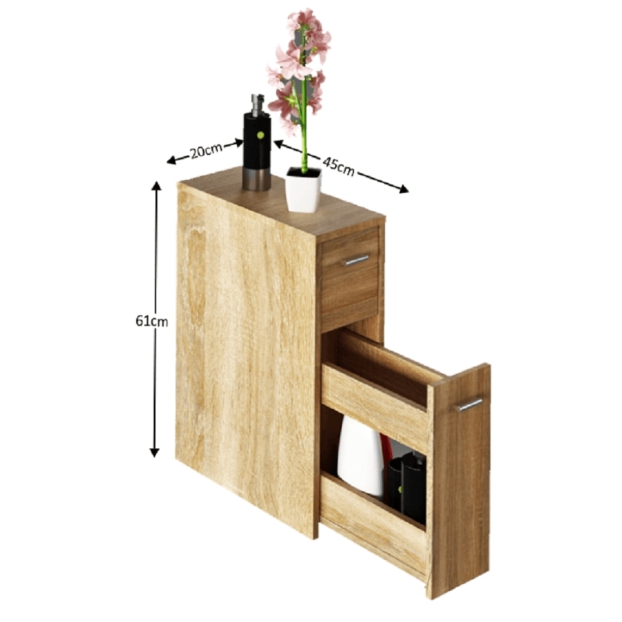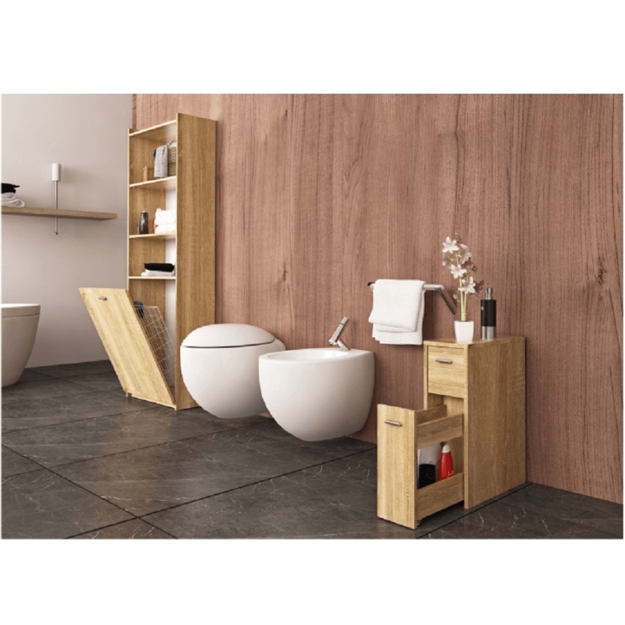 "Fürdőszoba szekrény NATALI TYP 7 Anyag: DTD laminált Szín: sonoma tölgy Méretek (SzéxMéxMa): 20x45x61 cm Anyag vastagság: 16 mm Bontásban szállítva."