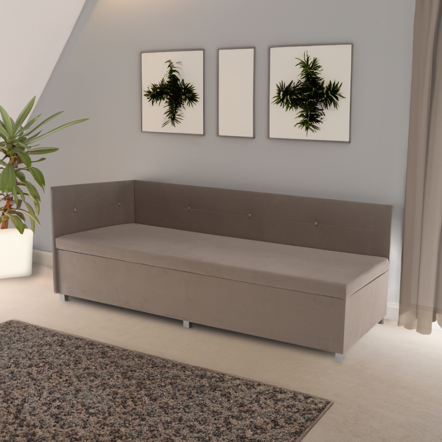 Anyag: laminált DTD/szövet Trinity 03 A szövet kopásállósága a Martindale teszt szerint: 210 000 ciklus Heverő magja: purhab T28 Szín: bézses szürke Méretek (SzxMéxMa): 93x204x75 cm Alvófelület (SzxHo): 90x200 cm Magasság a padlótól a matracig: 42 cm Teherbírás: 110 kg Matrac keménysége: H3 Univerzális Tárhely Oldalsó billenőmechanizmus Praktikus oldalsó homlok Az előlapok megakadályozzák a fal súrlódását Magas homlokrész Steppelt homlokrész Dekoratív gombok Szétszerelve szállítva