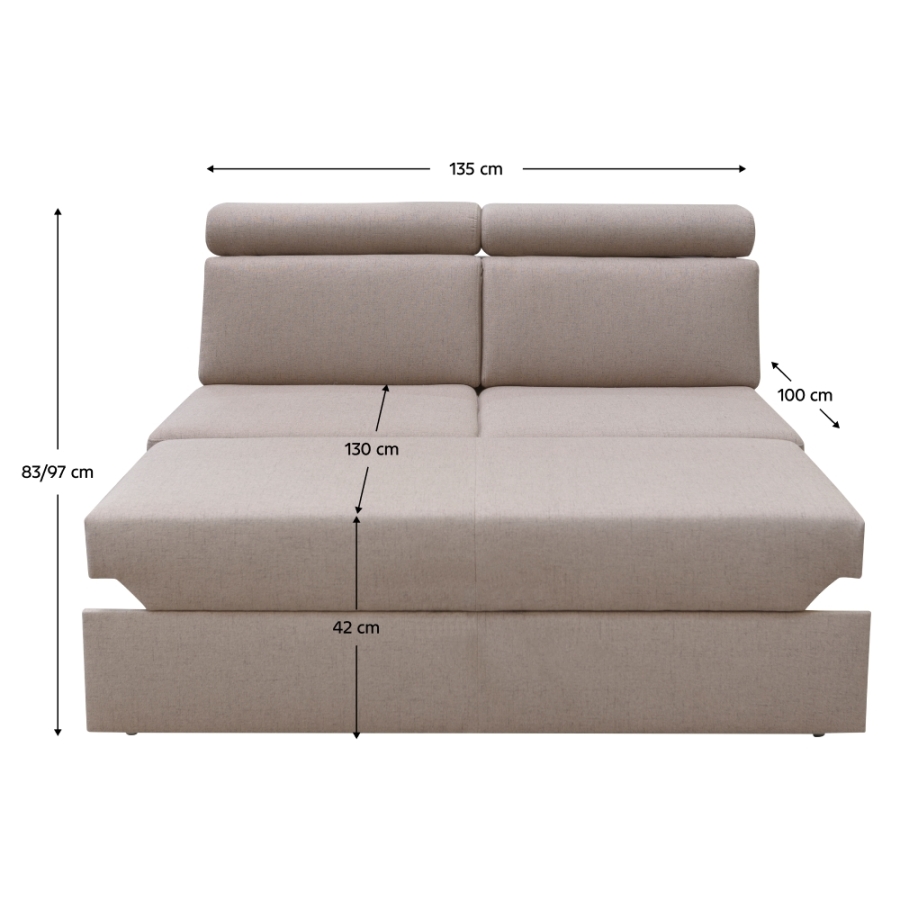 Kétszemélyes ülőrész 2 BB ZF, MARIETA luxus ülőgarnitúrához, megrendelésre Méretek: (SzéxMéxMa): 135x100x83/97 cm Az alsó tér magassága a padlótól: 5 cm Terhelhetőség ágyanként: 90 kg Anyag: CABLO A szövet kopásállósága: 72 000 Martindale Szín: bézs Rendelhető 7-féle színváltozatban Cablo szövetből vagy 7-féle színárnyalatban textilbőrből Egyedi megrendelés esetén szükség van az adott összegnek a 10%-át befizetni,mint előleg. Az előleg befizetése után az Ön követelményét benyújtjuk a gyártónak. . Szállítási határidő 8-10 hét.