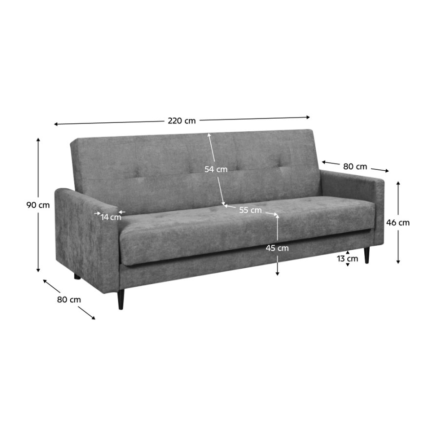 Anyag: szövet Enjoy 23 A szövet kopásállósága a Martindale teszt szerint: 45 000 ciklus Szín: szürke Méretek (SzxMéxMa): 220x80x90 cm Ülés magassága: 45 cm Ülés mélysége: 55 cm Háttámla magassága: Kartámasz mérete (SzxMéxMa): Alvófelület (SzxHo): 115x195 cm Lábak Lábak színe: Az alsó tér magassága a padlótól: Töltet: falista rugó/purhab Teherbírás/ személy: 90 kg Teljesen kárpitozott Kihúzható Tárhellyel Szétszerelve szállítva Az Enjoy szövet 8 színváltozatában megrendelhető ár: 206 500 Ft. Egyedi megrendelés esetén a megadott összeg 10%-át előlegként szükséges befizetni. Az előleg befizetése után kérése a gyártásba kerül. Szállítási idő 6-8 hét.