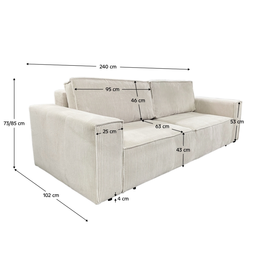 Anyag: szövet Poso 105 A szövet kopásállósága a Martindale teszt szerint: 90.000 ciklus Szín: tejszínes Méretek (SzxMéxMa): 240x102x73/85 cm Ülés magassága: 43 cm Ülés mélysége: 63 cm Alvófelület (SzxHo):150x190 cm Az alsó tér magassága a padlótól: 4 cm Kartámasz magassága: 53 cm Kartámasz szélessége: 25 cm Műanyag lábak Lábak színe: fekete Töltet: falista rugó/purhab Teherbírás/személy: 90 kg Teljesen kárpitozott Kihúzható Tárhellyel Párnákkal Nagy párnák méretei: 95x46 cm BIG SOFA kialakítás Praktikus Modern Szétszerelve szállítva A Poso szövet 8 színváltoztatában megrendelhető. Egyedi megrendelés esetén az adott összeg 10%-át előlegként kell megfizetni. Az előleg megfizetése után rendelés gyártásra kerül. A szállítási idő 6-8 hét.