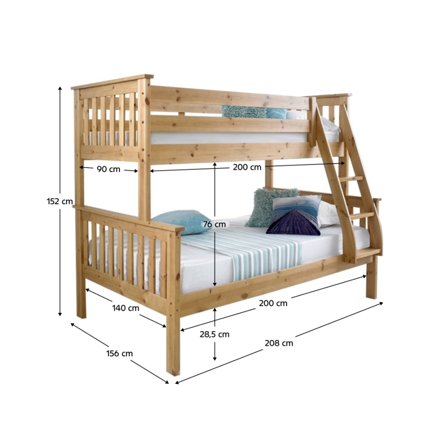 Szétrakható emeleteságy ágyráccsal LUINI Szín: természetes Anyag: fenyőfa/furnérozott (ágyrács) Méretek (SzéxMéxMa): 208x156x152 cm Alsó fekvőterület (SzéxMé): 140x200 cm Felső fekvőterület (SzéxMé): 90x200 cm Felső alvó rész teherbírasa : 80 kg Alsó alvó rész teherbírasa : 100 Kg Szállítás ágyráccsal. Szállítás matrac nélkül. Hozzárendelhető matrac a mi kínálatunkból. Szállítás szétszerelve.