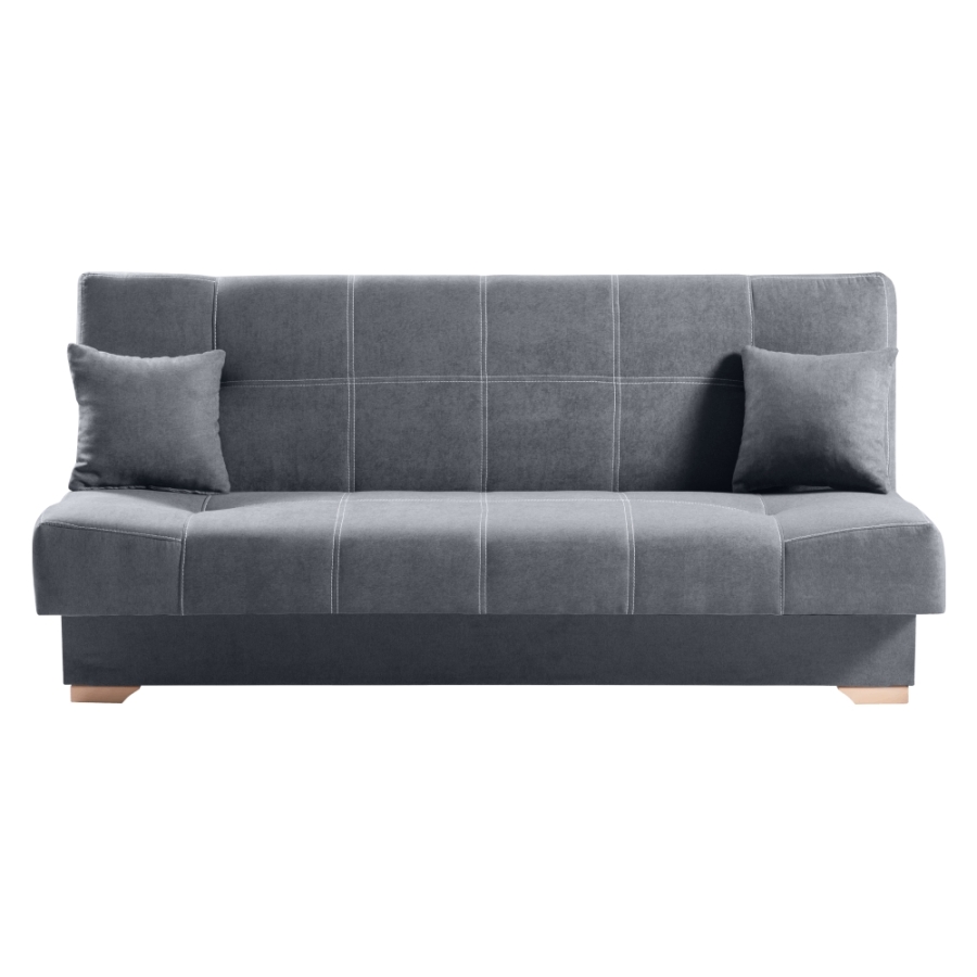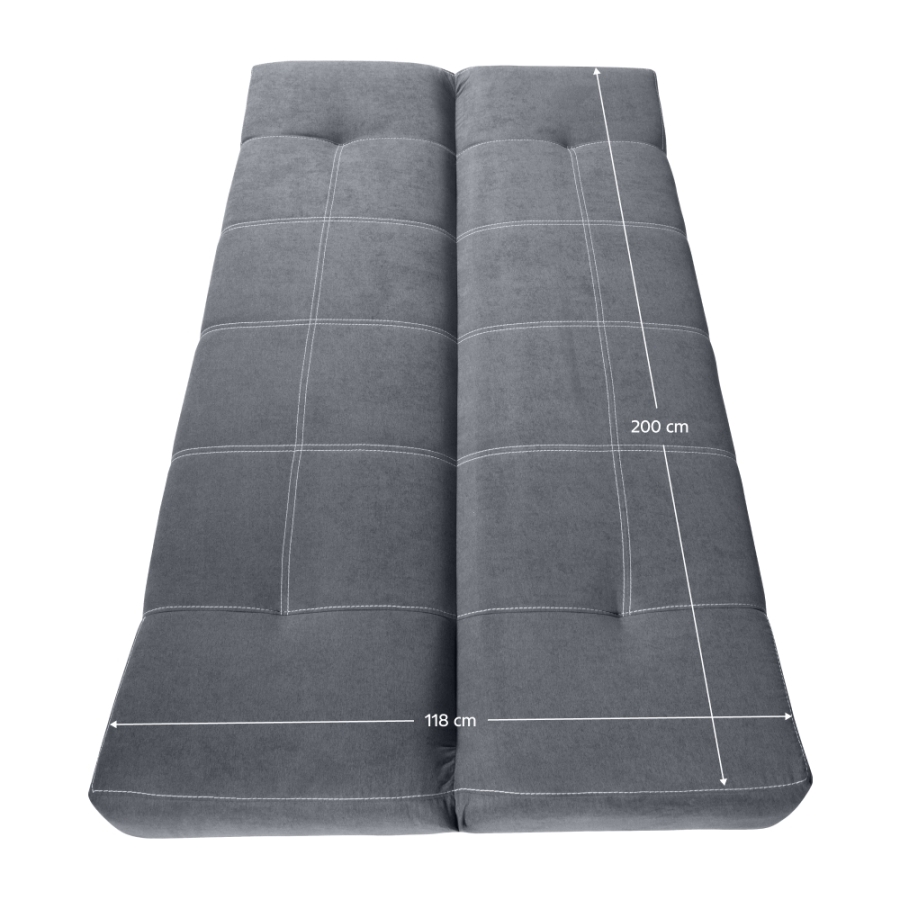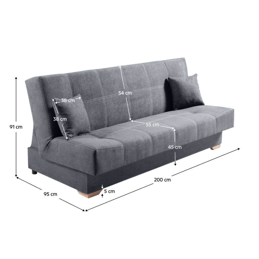 Anyag: Twist 20 szövet A szövet kopásállósága a Martindale teszt szerint: 45 000 ciklus Szín: szürke Méretek (SzxMéxMa): 200x95x91 cm Ülés mélysége: 55 cm Ülés magassága: 45 cm Alvófelület (SzxHo): 118x200 cm Háttámla magassága: 54 cm Fa lábak Az alsó tér magassága a padlótól: 4,5 cm Fehér varrat Töltet: bonellrugó/purhab Teherbírás/személy: 90 kg Kinyitható Tárhellyel Két párnával szállítva Párnák mérete (SzéxMé): 38x38 cm Modern Praktikus Klasszikus Szétszerelve szállítva