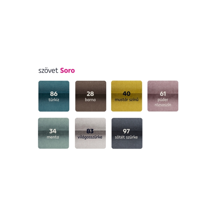 A Soro szövet 7 színárnyalatában rendelhető ár 716 900 Ft. A szállítási idő 6-8 hét. Egyedi megrendelés esetén az összeg 10%-át előlegként szükséges befizetni. Az előleg befizetése után a megrendelése gyártásba kerül.