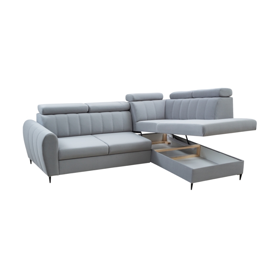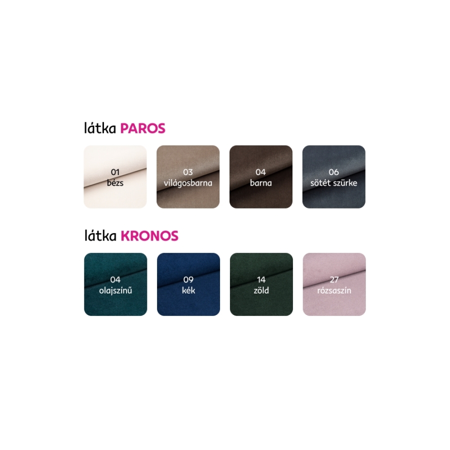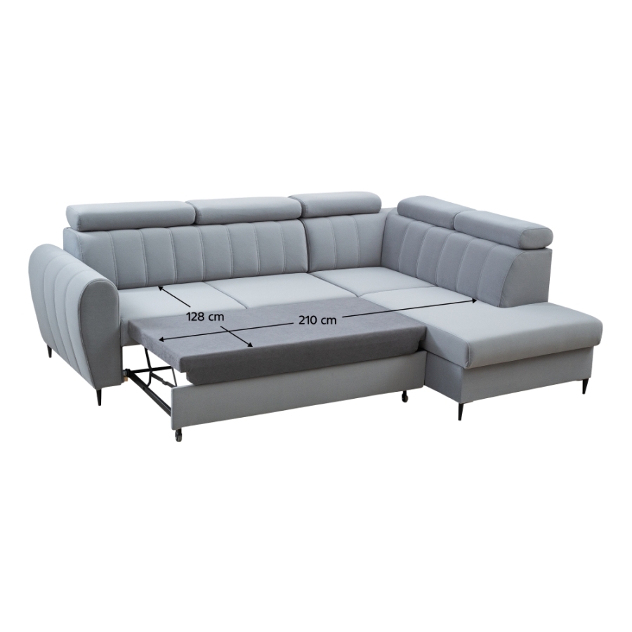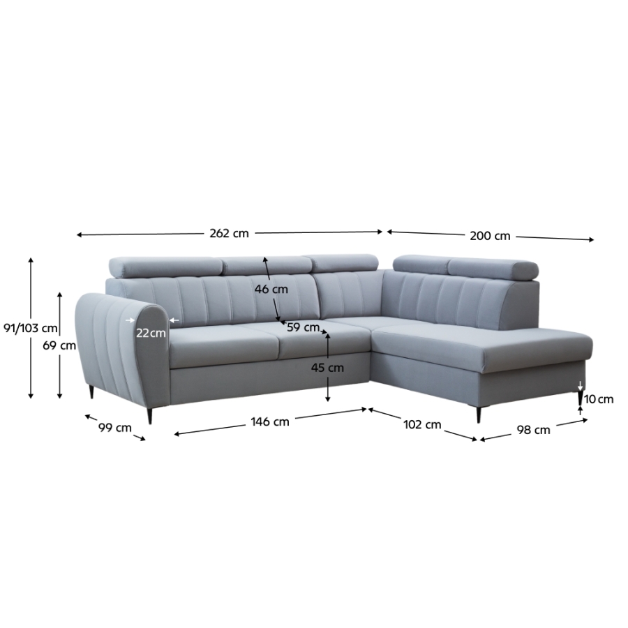 Kárpit anyaga: szövet Paros 05 A szövet kopásállósága a Martindale teszt szerint: 50 000 Kárpit színe: világosszürke Méretek (SzxMéxMa): 262x200x91/103 cm Alvófelület (SzxHo): 128x210 cm Ülés magassága: 45 cm Ülés mélysége: 46/59 cm Ottomán szélessége: 98 cm Ülőrész szélessége: 146 cm Karfák méretei (SzxMéxMa): 22x99x69 cm Az alsó tér magassága a padlótól: 10 cm Lábakon Lábak anyaga: fém Lábak színe: fekete Teherbírás/személy: 90 kg Töltet: Falista rugó + Pur hab Kinyitható Sarok Teljesen kárpitozott Jobbos kivitelezés Tárhellyel Állítható fejtámlák Szétszerelve szállítva Megrendelhető a Paros szövet 4 színárnyalatában és a Kronos szövet 4 színárnyalatban 6-8 hét szállítási idővel. Egyedi megrendelés esetén az összeg 10%-át előlegként szükséges befizetni. Az előleg befizetése után a megrendelése gyártásba kerül.
