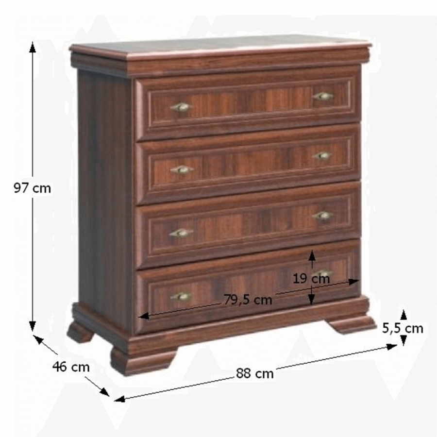 Komód KORA KK2 Anyag: laminált DTD/MDF lécek/fém fogantyúk Színváltozat: samoa king Méretek (SzéxMéxMa): 88x46x97 cm Váz vastagsága:15 mm Felsőlap vastagsága: 22 mm Alsólap vastagsága: 22 mm Az alsó tér magassága a padlótól: 10,5 cm 4-fiókos Szállítás: lapraszerelten