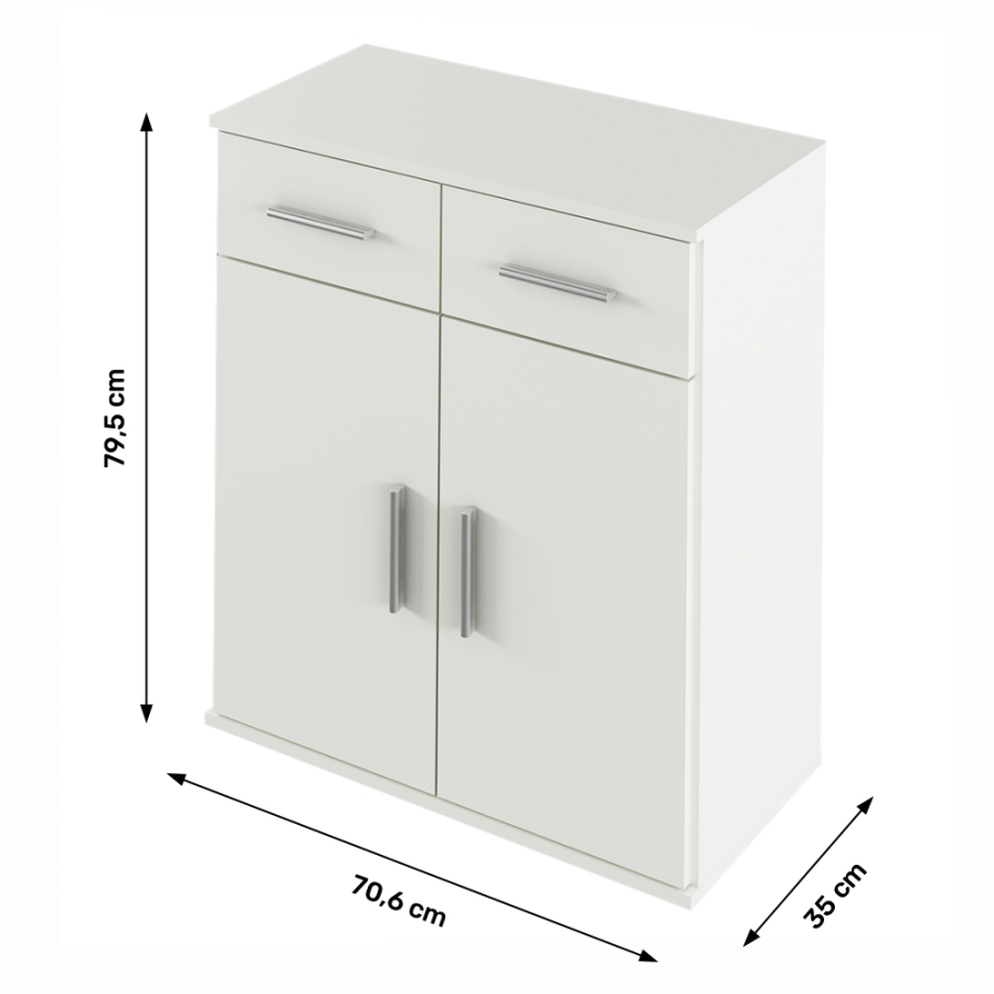 Anyag: laminált DTD Szín: fehér Méretek (SzxVxH): 70,6x35x79,5 cm Kétajtós Polcos Két fiók Fogantyúval Szétszerelve szállítva