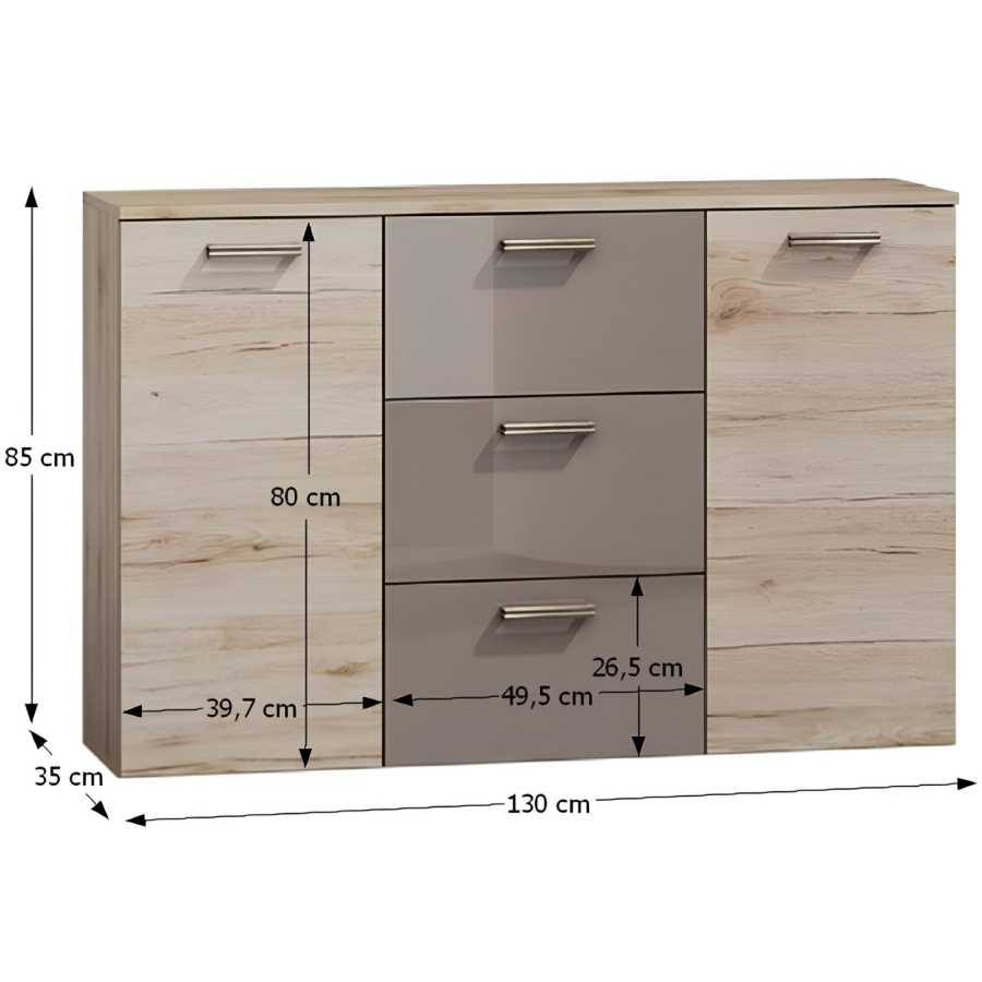 Praktikus komód Anyag: laminált DTD Színváltozat: san marino/latte magasfényű HG Komód méretei (SzéxMaxMé): 130x85x35 cm Szétszerelt állapotban szállítjuk