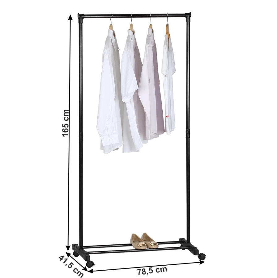 Anyag: fém/műanyag Szín: fekete Méretek (SzxMéxMa): 78,5x41,5x165 cm Praktikus Mozgatható Kerekekkel Két kerék fékkel Polccal 2 rúdból Szétszerelve szállítjuk