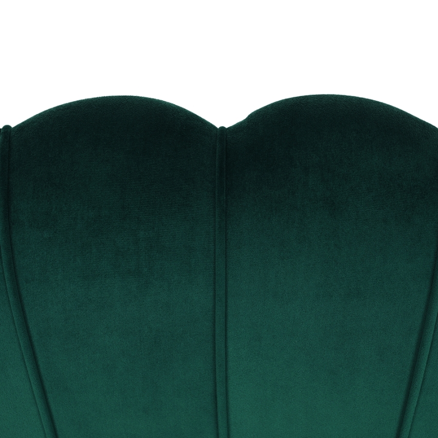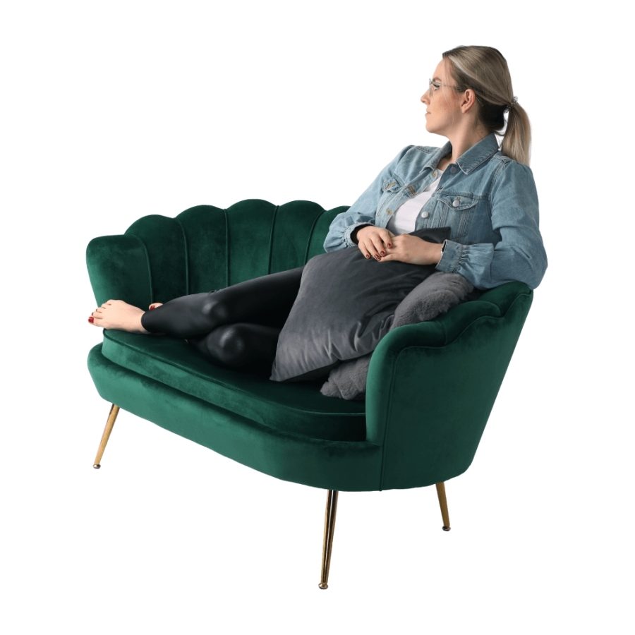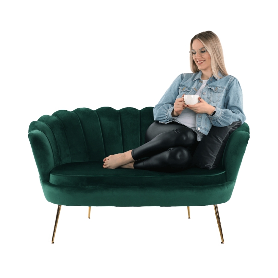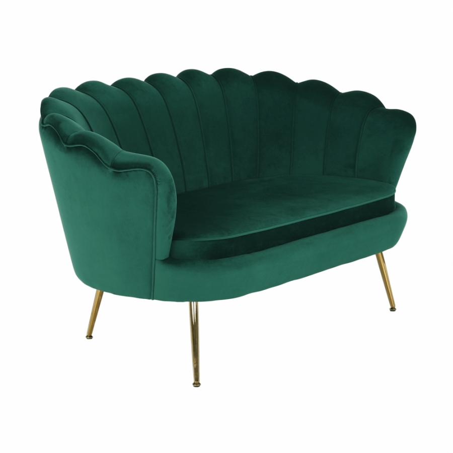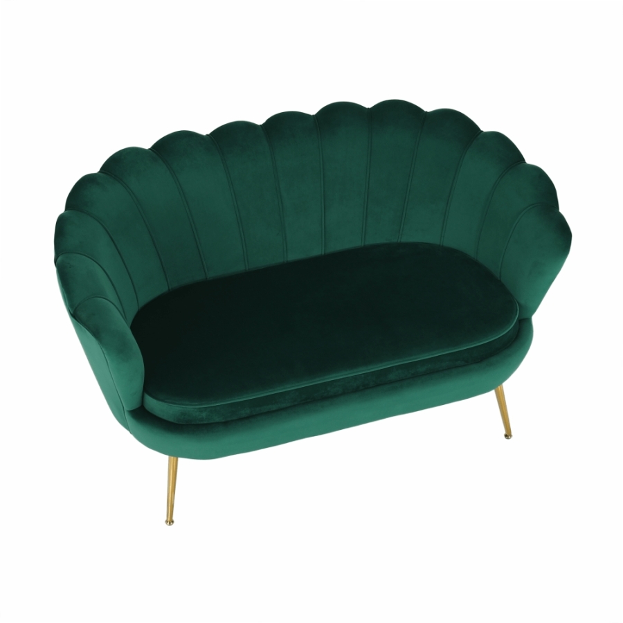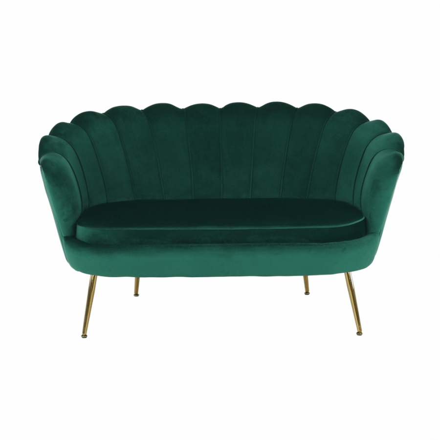Ülőlap anyaga: Velvet szövet A szövet kopásállósága: 80 000 Martindale Szín: smaragd 18 Lábak anyaga: fém Szín: gold króm-arany Méretei (SzéxMéxMa): 132x76x77 cm Ülés mélysége: 56 cm Ülés magassága: 44 cm Terhelhetőség: 180 kg Dizájnos Art-deco stílus Kagyló alak Modern kidolgozás Bontásban szállítva.
