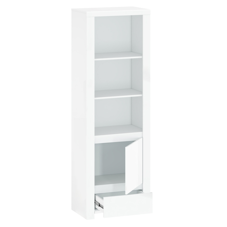 Anyag: laminált DTD/MDF Szín: fehér fényes Méretek (SzxMéxMa): 68x41,5x202 cm Anyag vastagsága: 1,6 cm ABS élek Ajtók MDF-ből Kombinált polcállványok Tartalmaz nyitott polcot, fiókot és szekrényt Univerzális ajtók Nyitott és zárt tárhely Modern dizájn és elegáns megjelenés Bontásban szállítva