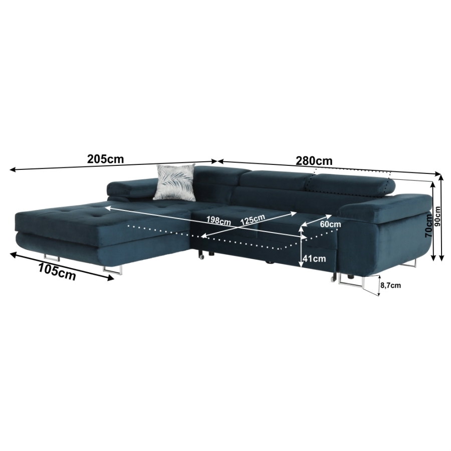 Anyag: szövet Monolith A szövet kopásállósága: 100 000 Martindale Szín: 77 kék/minta Méretek (SzéxMéxMa): 280x205x70/90 cm Ülésmagasság: 41 cm Ülésmélység: 60 cm Fekvőfelület (SzéxHo): 125x198 cm Alsó rész magassága a padlótól: 8,7 cm Ottomán szélessége: 105 cm Terhelhetőség ágyanként: 90 kg Balos kivitel rugós betét Kárpitozott Ágyfunkcióval Ágyneműtartóval Dekoratív varrás az ülőrészén 3 állítható fejtámla Ágyneműtartóval Párnákkal szállítva Bontásban szállítva Rendelhető 5 Monolith szövet színváltozatban ár 515 900 Ft. Egyedi megrendelés esetén szükség van az adott összegnek a 10%-át befizetni,mint előleg. Az előleg befizetése után az Ön követelményét benyújtjuk a gyártónak. Szállítási idő 6-8 hét.