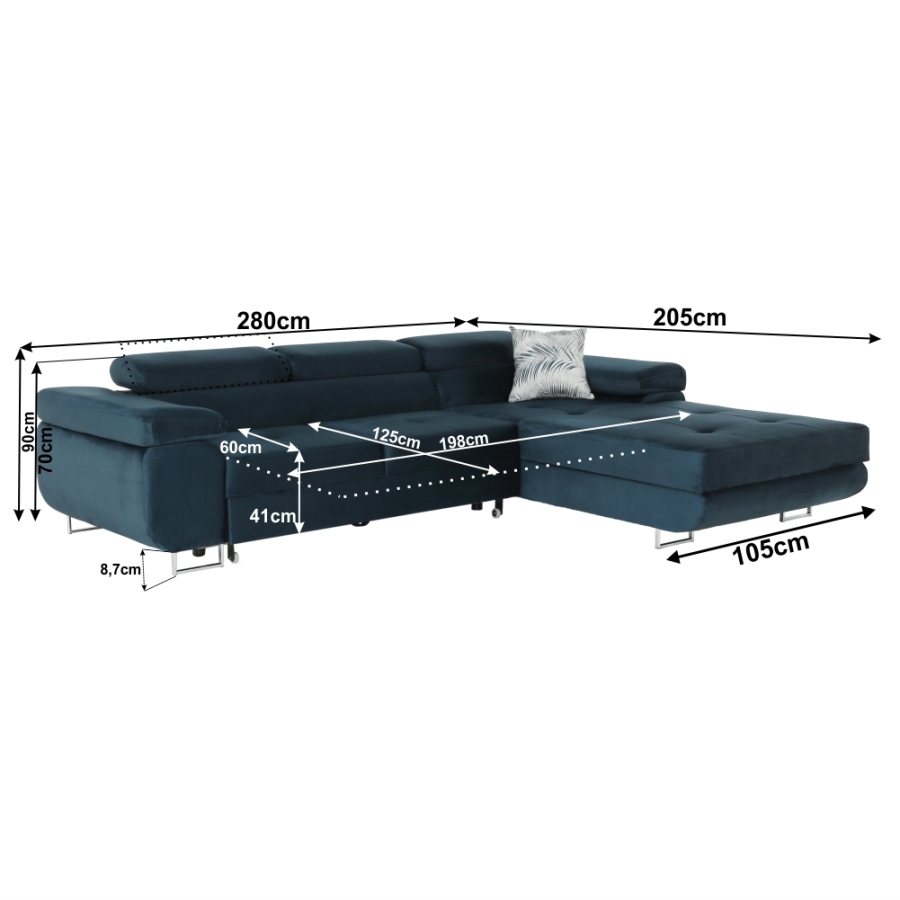 Anyag: szövet Monolith A szövet kopásállósága: 100 000 Martindale Szín: 77 kék/minta Méretek (SzéxMéxMa): 280x205x70/90 cm Ülésmagasság: 41 cm Ülésmélység: 60 cm Ottomán szélessége: 105 cm Fekvőfelület (SzéxHo): 125x198 cm Alsó rész magassága a padlótól: 8,7 cm Terhelhetőség ágyanként: 90 kg Jobbos kivitel Rugós betét Kárpitozott Ágyfunkcióval Ágyneműtartóval Dekoratív varrás az ülőrészén 3 állítható fejtámla Ágyneműtartóval Párnákkal szállítva Bontásban szállítva Rendelhető 5 Monolith szövet színváltozatban ár 515 900 Ft. Egyedi megrendelés esetén szükség van az adott összegnek a 10%-át befizetni,mint előleg. Az előleg befizetése után az Ön követelményét benyújtjuk a gyártónak. Szállítási idő 6-8 hét.