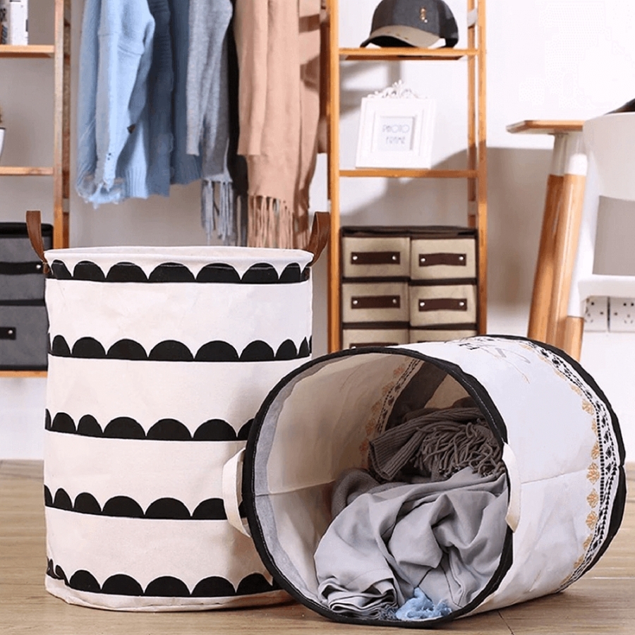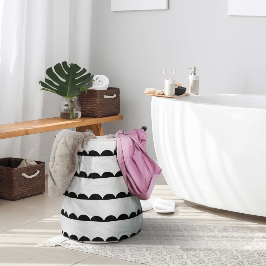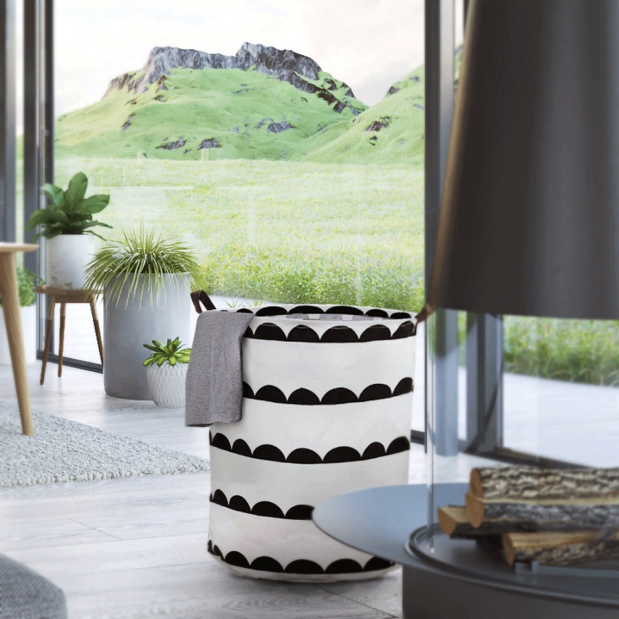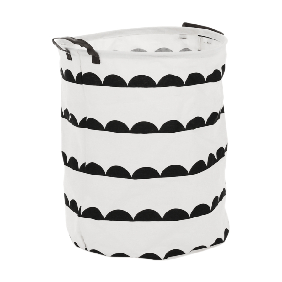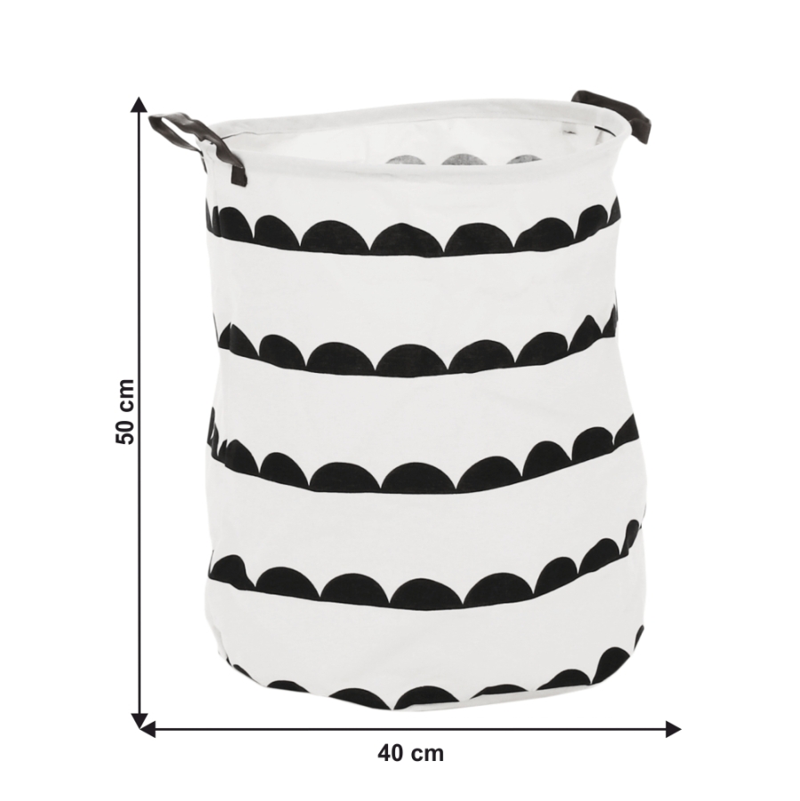 Stílusos szennyestartó kosár Anyag: szövet 100%-os poliészter Szín: fehér/fekete minta Méretek (SzéxMéxMa): 40x40x50 cm