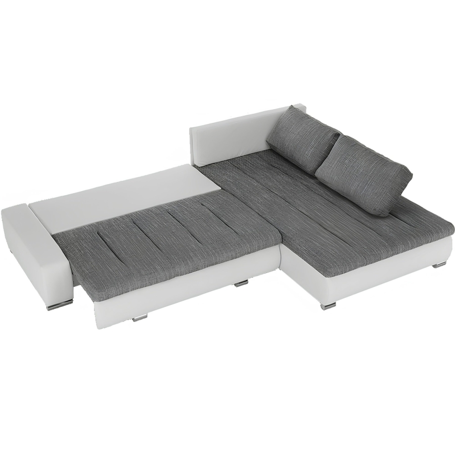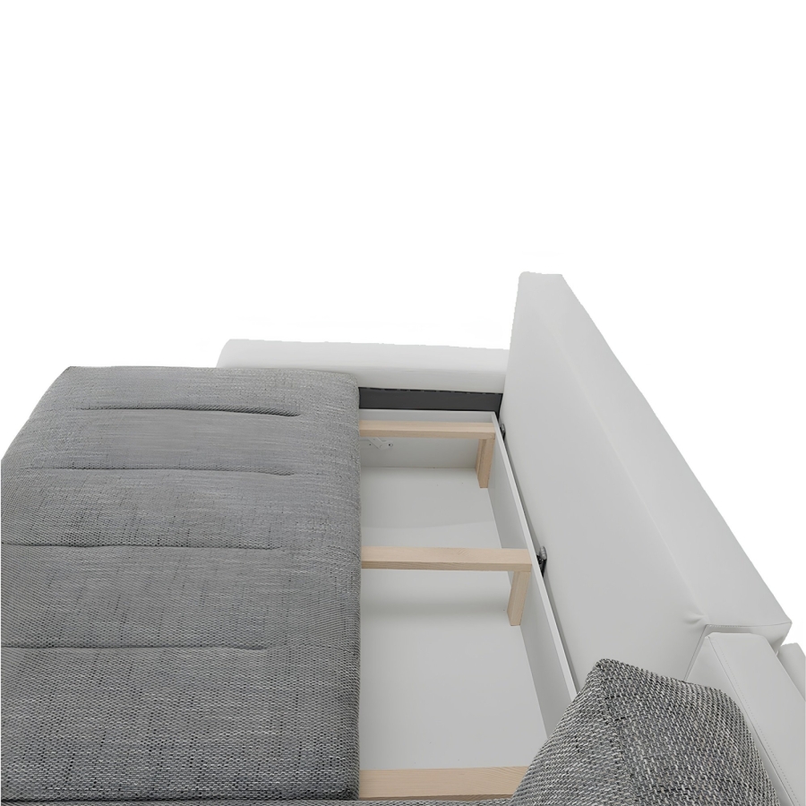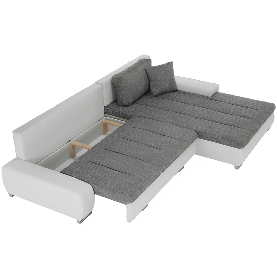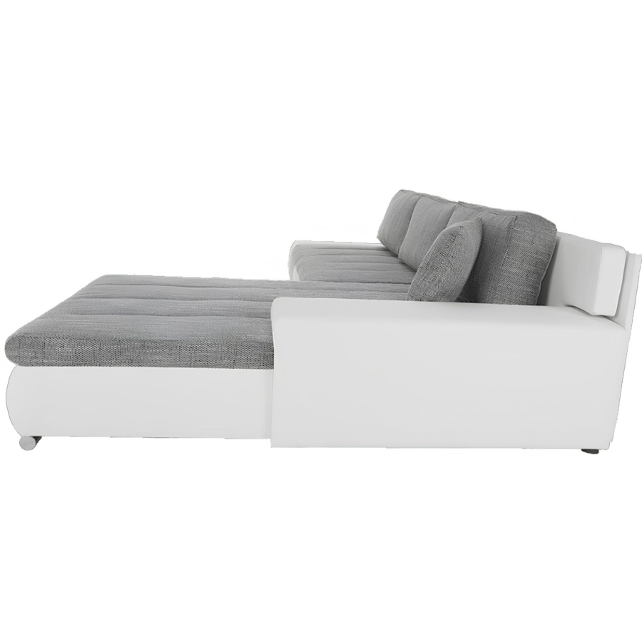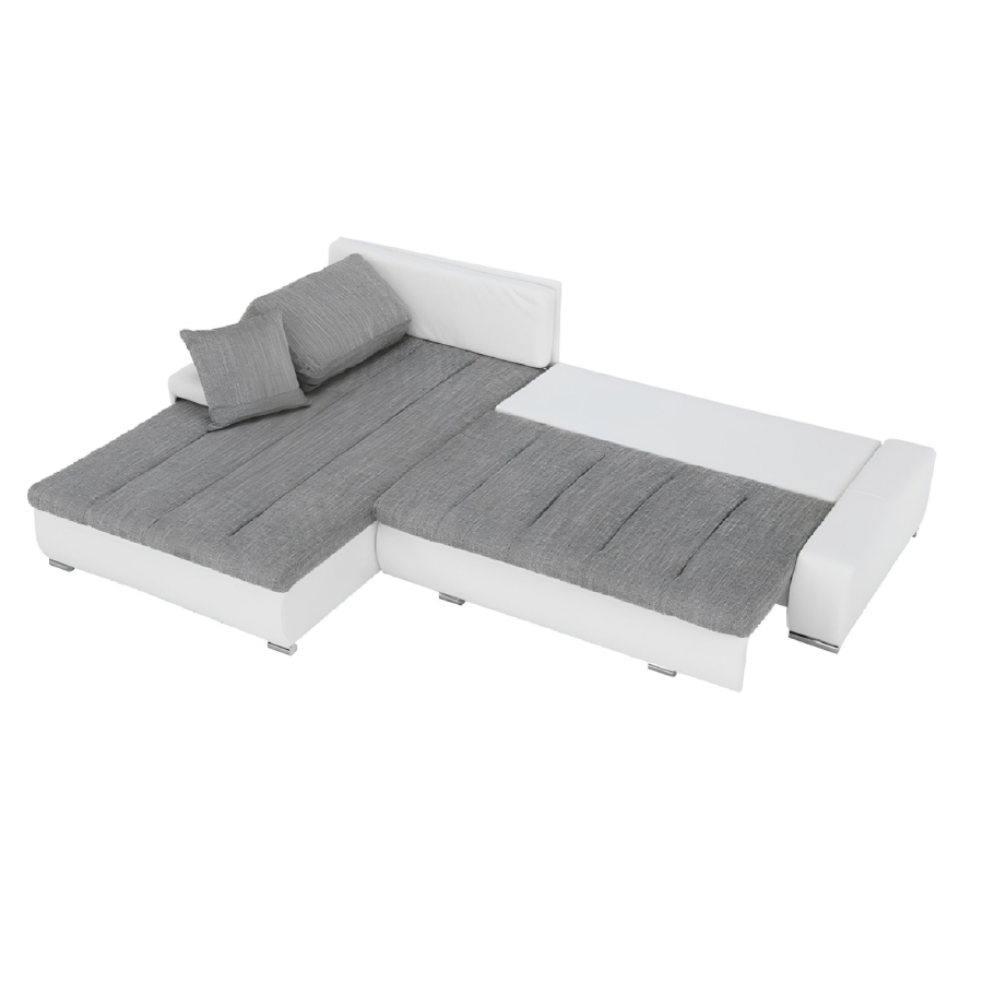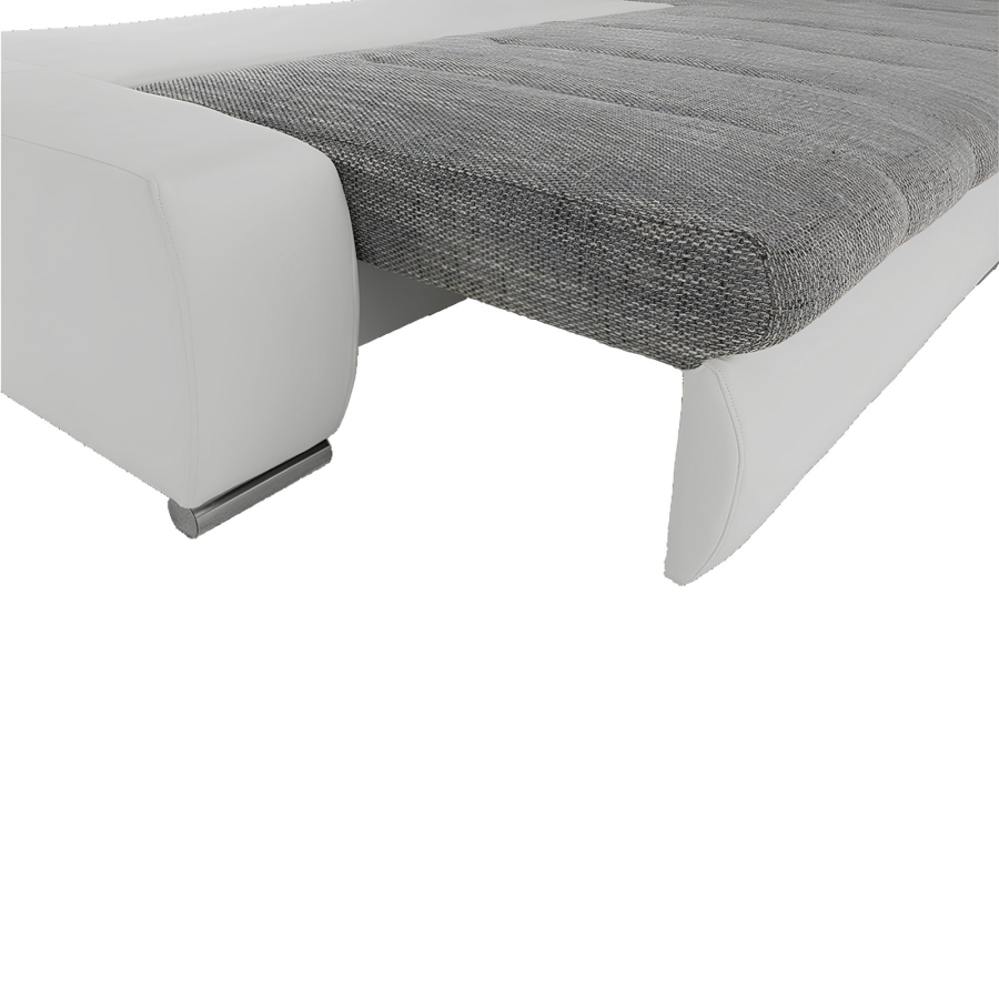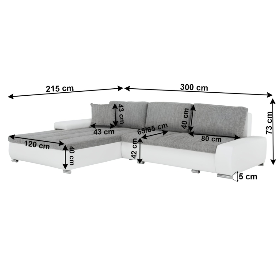 Kinyitható kárpitozott sarokülőgarnitúra rakodótérrel, univerzális B/J Változat, fehér műbőr/ Berlin 01 szürke melír , A szövet kopásállósága: 55 000 Martindale A textilbőr kopásállósága: 100 000 Martindale bonell ülőrész, Méretek (SzéxMéxMa): 300x215x72 cm, Fekvőterület (SzéxH): 150x240 cm. Ottomán szélessége: 120 cm Terhelhetőség: 90 kg Egyénimegrendelés lehetséges 4 szín-változatban texilbőrből kombinálva a Berlin szövet 4 színváltozatával. Ár: 411 500 Ft. Szállítási idő 6-8 hét.