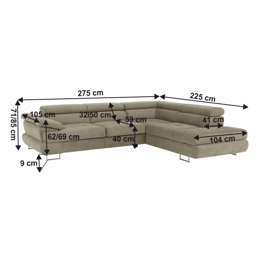 Anyag: szövet Soro 13 A szövet kopásállósága a Martindale teszt szerint: 90 000- 100 000 ciklus Szín: világosbarna melír Méretek (SzxMéxMa): 275x225x71/85 cm. Ülés magassága: 40 cm Ülés mélysége: 59 cm Az alsó tér magassága a padlótól: 9 cm Háttámla magassága: 32/50 cm A lehajtható háttámla mélysége: 41 cm Kartámasz (MéxMa): 105x62/69 cm Ottomán szélessége: 104 cm Teherbírás: 90 kg Sarok Dekoratív steppelés Érdekes támla 3 állítható fejtámla 5 fokban állítható támlák Teljesen kárpitozott Rugós töltelék Fém lábak króm felülkezeléssel Jobbos kivitelezés Díszpárnák nélkül szállítva Szétszerelve szállítva A kanapét a Soro szövet 7 színváltozatában megvásárolhatja a mintafüzet alapján is BUTON R összecsukható 633 800 Ft és BUTON P fix 579 900 Ft. Választását közvetlenül a megrendelés megjegyzései közé írja be. Egyedi megrendelés esetén az adott összeg 10%-át előlegként szükséges befizetni. Az előleg befizetése után a kérése gyártásba kerül. A szállítási idő 6-8 hét.