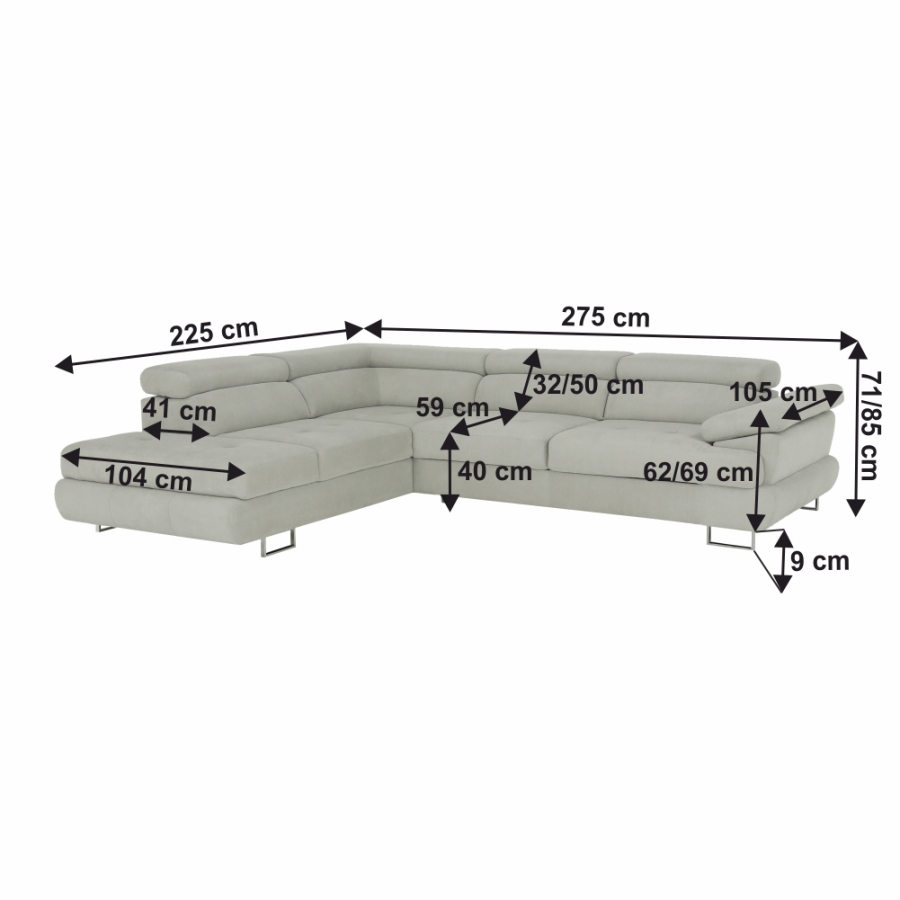 Anyag: szövet Soro 83 A szövet kopásállósága a Martindale teszt szerint: 90 000- 100 000 ciklus Szín: világosszürke Méretek (SzxMéxMa): 275x225x71/85 cm. Ülés magassága: 40 cm Ülés mélysége: 59 cm Az alsó tér magassága a padlótól: 9 cm Háttámla magassága: 32/50 cm A lehajtható háttámla mélysége: 41 cm Kartámasz (MéxMa): 105x62/69 cm Ottomán szélessége: 104 cm Teherbírás: 90 kg Sarok Dekoratív steppelés Érdekes támla 3 állítható fejtámla 5 fokban állítható támlák Teljesen kárpitozott Rugós töltelék Fém lábak króm felülkezeléssel Balos kivitelezés Díszpárnák nélkül szállítva Szétszerelve szállítva A kanapét a Soro szövet 7 színváltozatában megvásárolhatja a mintafüzet alapján is BUTON R összecsukható 633 800 Ft és BUTON P fix 579 900 Ft. Választását közvetlenül a megrendelés megjegyzései közé írja be. Egyedi megrendelés esetén az adott összeg 10%-át előlegként szükséges befizetni. Az előleg befizetése után a kérése gyártásba kerül. A szállítási idő 6-8 hét.