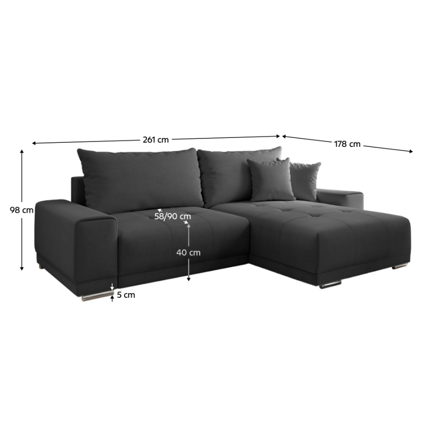 Anyag: szövet SORO A szövet kopásállósága: 90 000 - 100 000 Martindale Kivitelezés: 97 sötétszürke Méretek (SzxMéxMa): 261x178x98 cm Alvófelület (SzxHo): 148x203 cm Ülés magassága: 40 cm Ülés mélysége: 58/90 cm Az alsó tér magassága a padlótól: 5 cm Teljesen kárpitozott Univerzális (B/J) Sarok Kinyitható Tárhellyel Dekoratív steppelés Párnákkal Rugós falista/PUR-hab Szétszerelve szállítjuk. Megrendelhető 6 színű Alfa szövetben arón: 369 500 Ft. Egyedi megrendelés esetén az adott összeg 10%-a előlegként kifizetendő. Az előleg kifizetése után a megrendelését gyártásra bocsátjuk. Szállítási idő 6-8 hét.