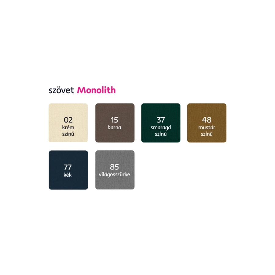 A Monolith szövet 6 színváltozatában megrendelhető ár: 739 500 Ft. Egyedi megrendelés esetén a megadott összeg 10%-át előlegként szükséges befizetni. Az előleg befizetése után a megrendelése gyártásba kerül. A szállítási idő 6-8 hét.