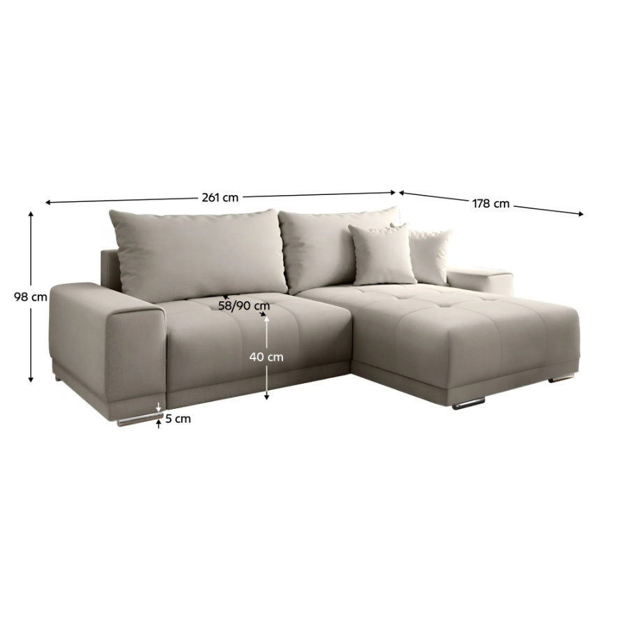 Anyag: szövet SORO A szövet kopásállósága: 90 000 - 100 000 Martindale Kivitelezés: 23 Taupe szürkésbézs Méretek (SzxMéxMa): 261x178x98 cm Alvófelület (SzxHo): 148x203 cm Ülés magassága: 40 cm Ülés mélysége: 58/90 cm Az alsó tér magassága a padlótól: 5 cm Teljesen kárpitozott Univerzális (B/J) Sarok Kinyitható Tárhellyel Dekoratív steppelés Párnákkal Rugós falista/PUR-hab Szétszerelve szállítjuk. Megrendelhető 6 színű Alfa szövetben arón: 369 500 Ft. Egyedi megrendelés esetén az adott összeg 10%-a előlegként kifizetendő. Az előleg kifizetése után a megrendelését gyártásra bocsátjuk. Szállítási idő 6-8 hét.