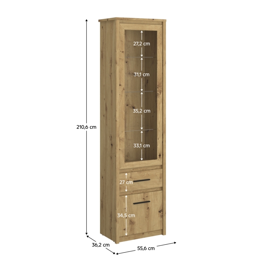 Anyag: laminált DTD/ABS élek Szín: artisan tölgy Méretek (SzxMéxMa): 55,6x36,2x210,6 cm Anyag vastagsága: 1,6-3,2 cm Műanyag fogantyúk Fogantyúk színe: fekete Szekrény ajtókkal Fiók Fiók magassága: 27 cm Üveges ajtókat tartalmaz Üveges polcok Szétszerelve szállítva