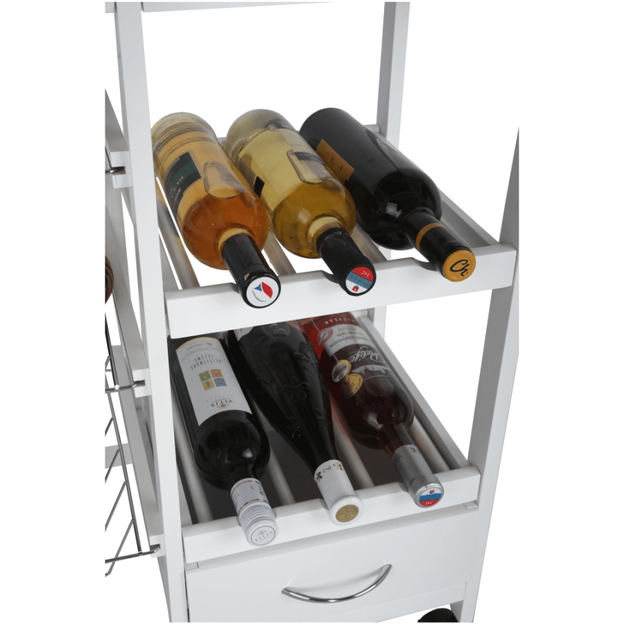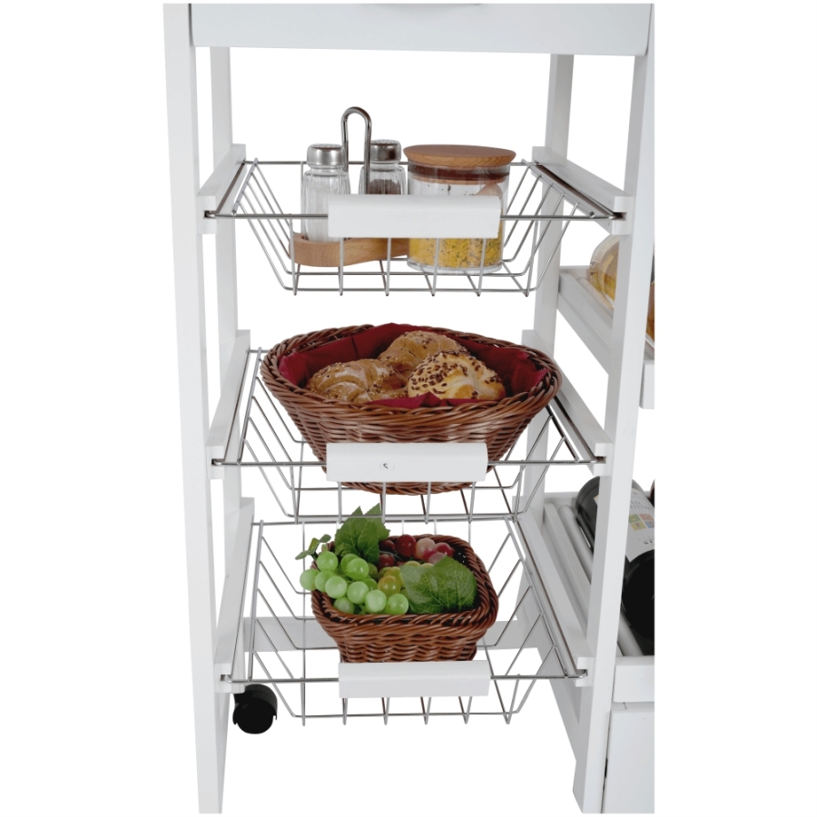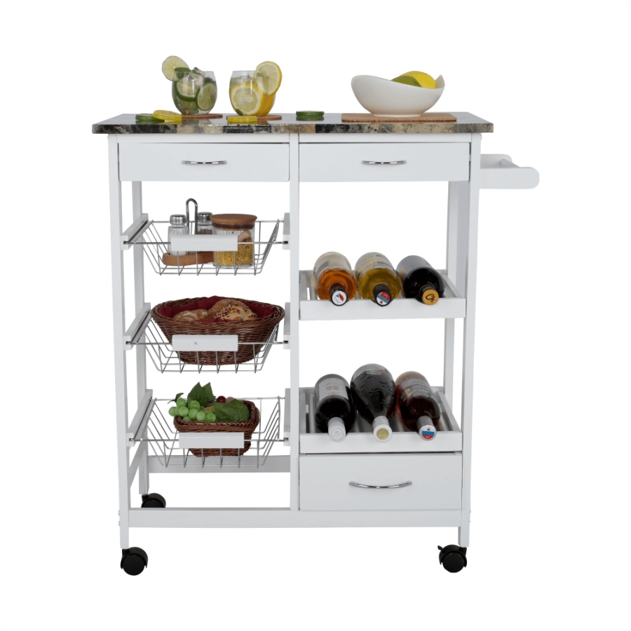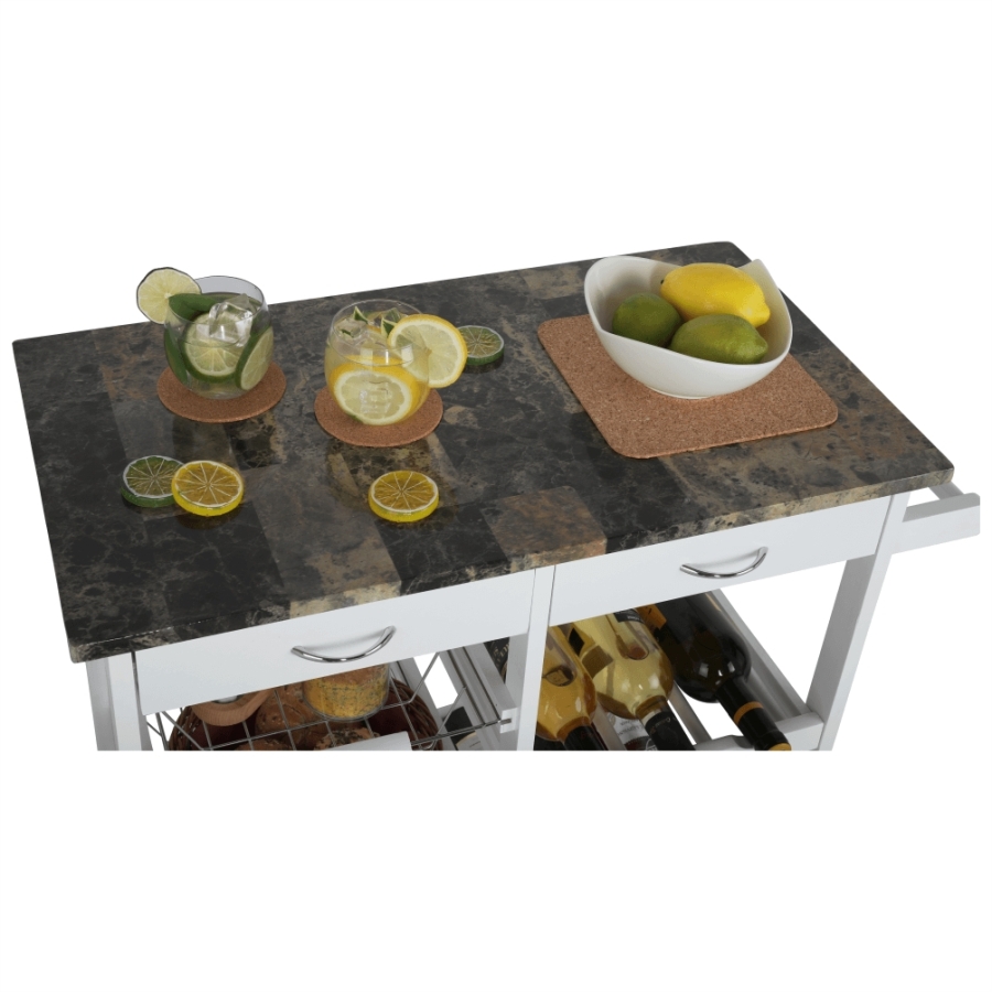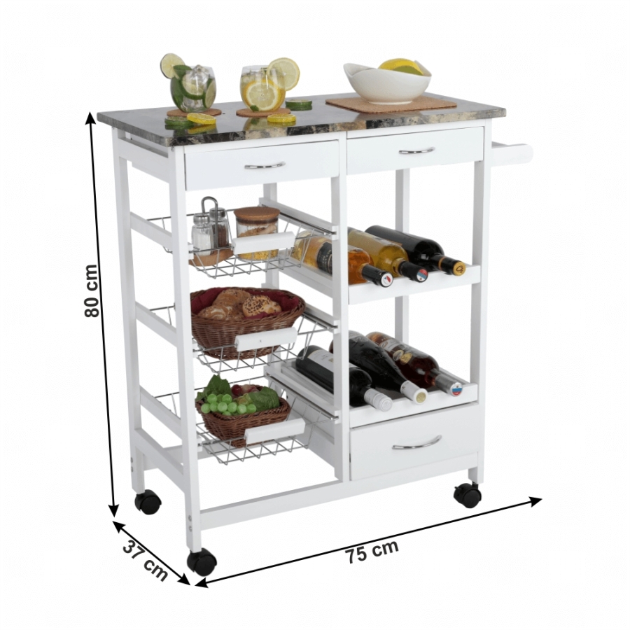 Zsúrkocsi SEMIR Anyag: MDF+PVC/fa Szín: fehér/márvány Méretek (SzxVxH): 75x37x80 cm Kerekeken 2 fék 2 polc 3 fiók 3 fém kosár 2 polc palackokra Modern dizájn Bontásban szállítva.