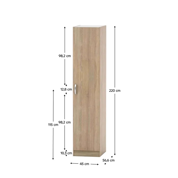1 ajtós szekrény, BETTY 2 Anyag: laminált DTD Szín: sonoma tölgy Méretek (SzéxMéxMa): 45x56,6x220 cm Váz vastagsága: 16 mm Szétszerelve szállítjuk.