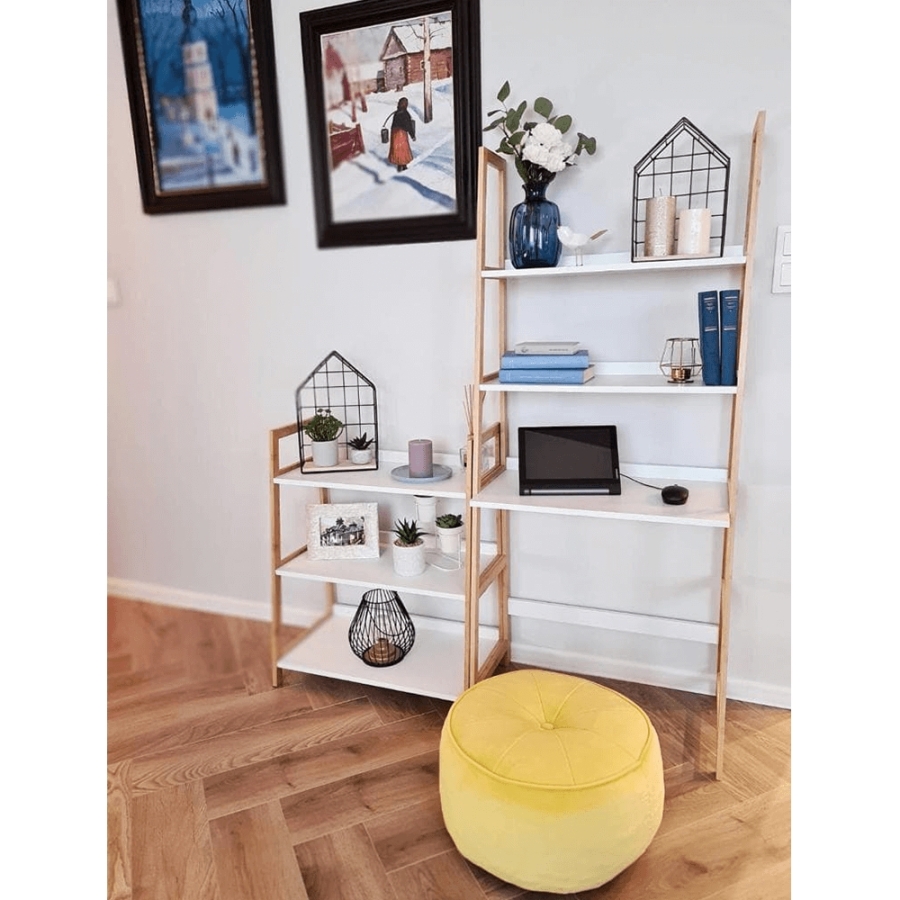 Többfunkciós polcos állvány KOEN TYP 1 Anyag: MDF/lakkozott bambusz Szín: fehér/természetes Méretek (SzxMxMa): 63x36x77,5 cm Az állvány anyagvastagsága: 1,4 cm Polc anyagvastagsága: 1,6 cm Teherbírás polconként: 5 kg 3 polc Felső polc mélysége: 27,4 cm Középső polc mélysége: 30,3 cm Alsó polc mélysége: 33,2 cm Hely a felső és a közepső polc között: 26,2 cm Hely a közepső és az alsó polc között: 27 cm Modern dizájn Praktikus Szétszerelve szállítjuk