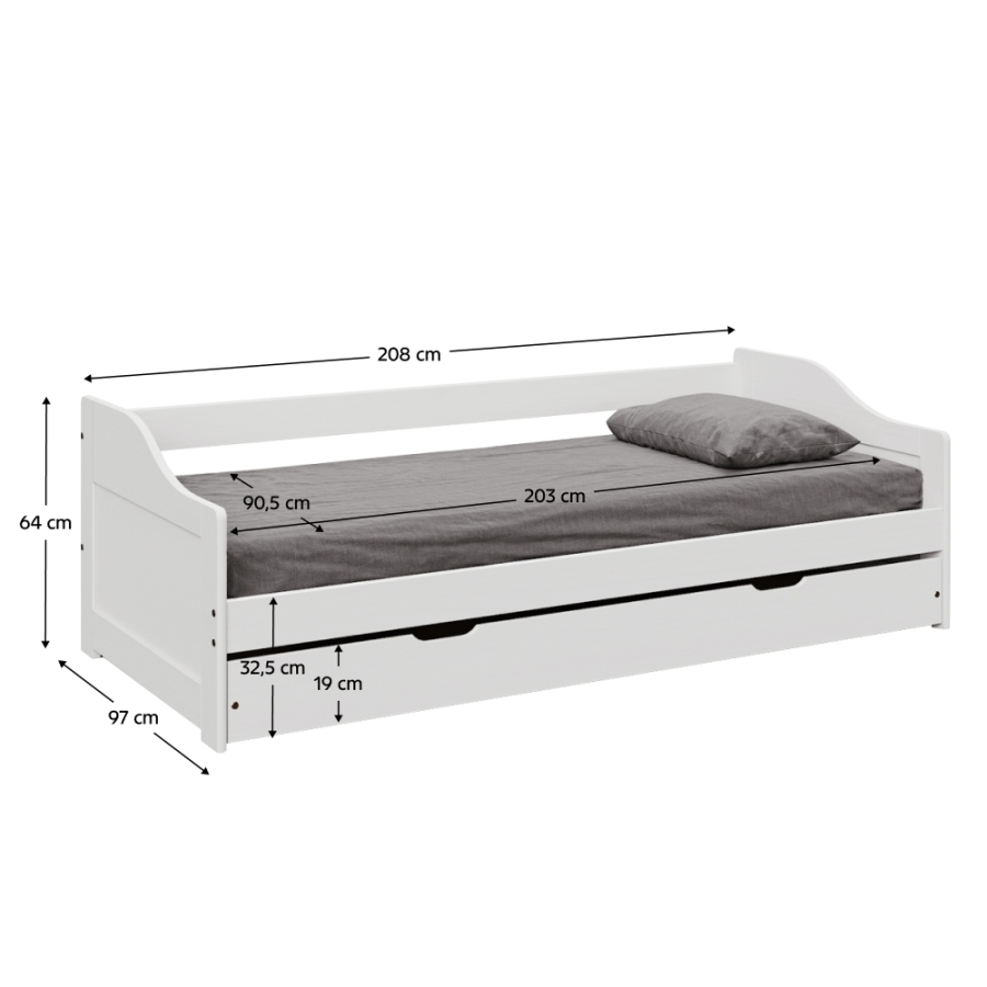 Ágy kihúzható pótággyal, fehér, tömörfa, 90x200, LAURA NEW