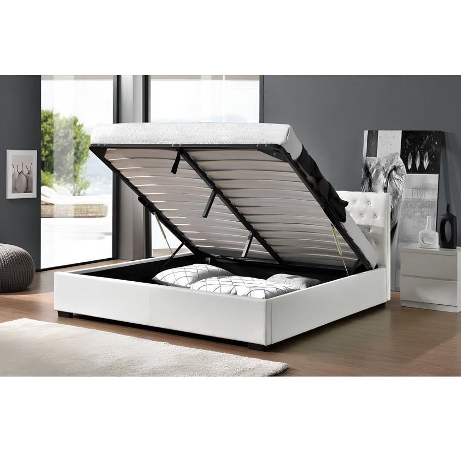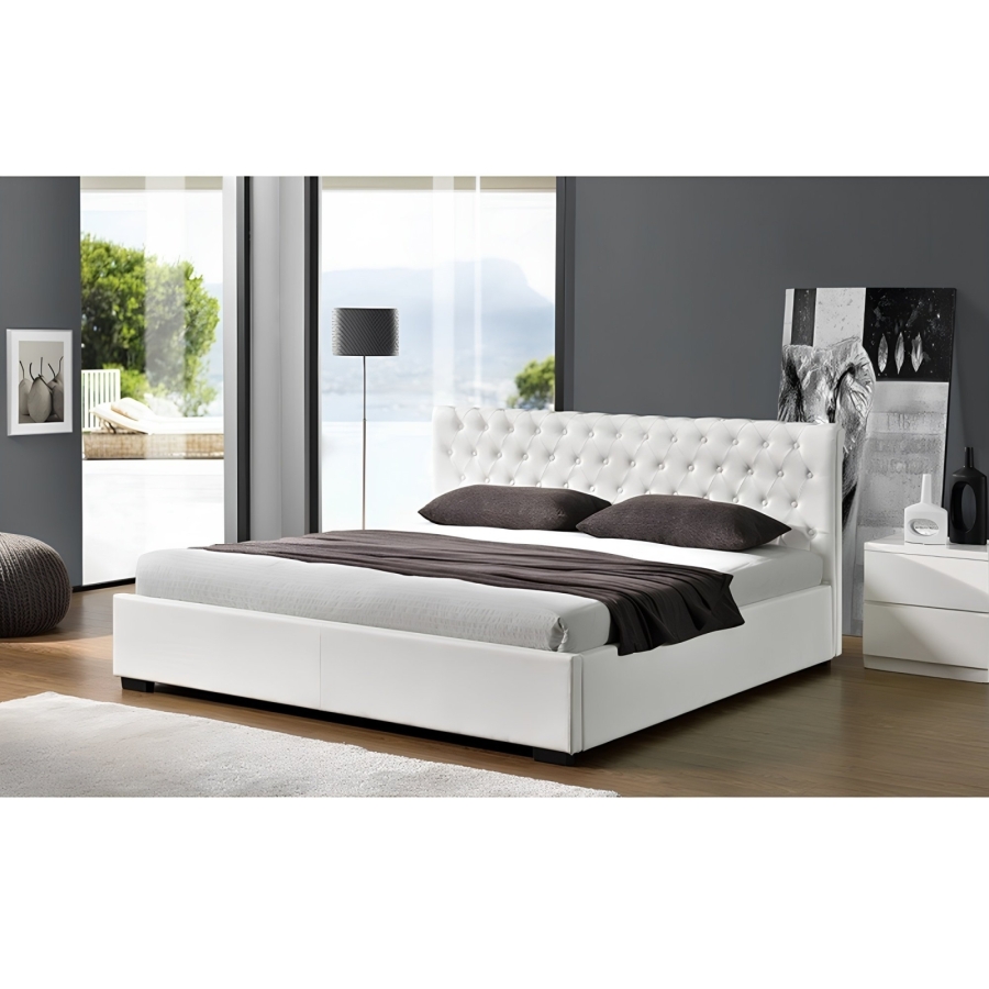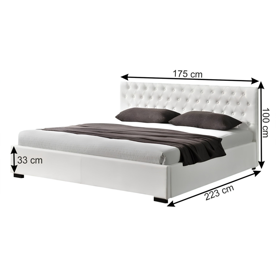 Ágy DORLEN 2 NEW steppelt támlával, rakodótérrel és lamellás ágyráccsal. Fehér textilbőr színben. A szövet kopásállósága: 100 000 Martindale Mérete (SzéxMéxMa): 175x223x100 cm Fekvőfelület (SzéxHo): 163x200 cm Terhelhetőség: 110 kg Az ágyhoz ajánljuk a 163x200 cm méretű matrac vásárlását. Lapraszerelten szállítva, matrac nélkül.