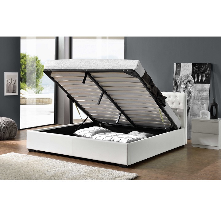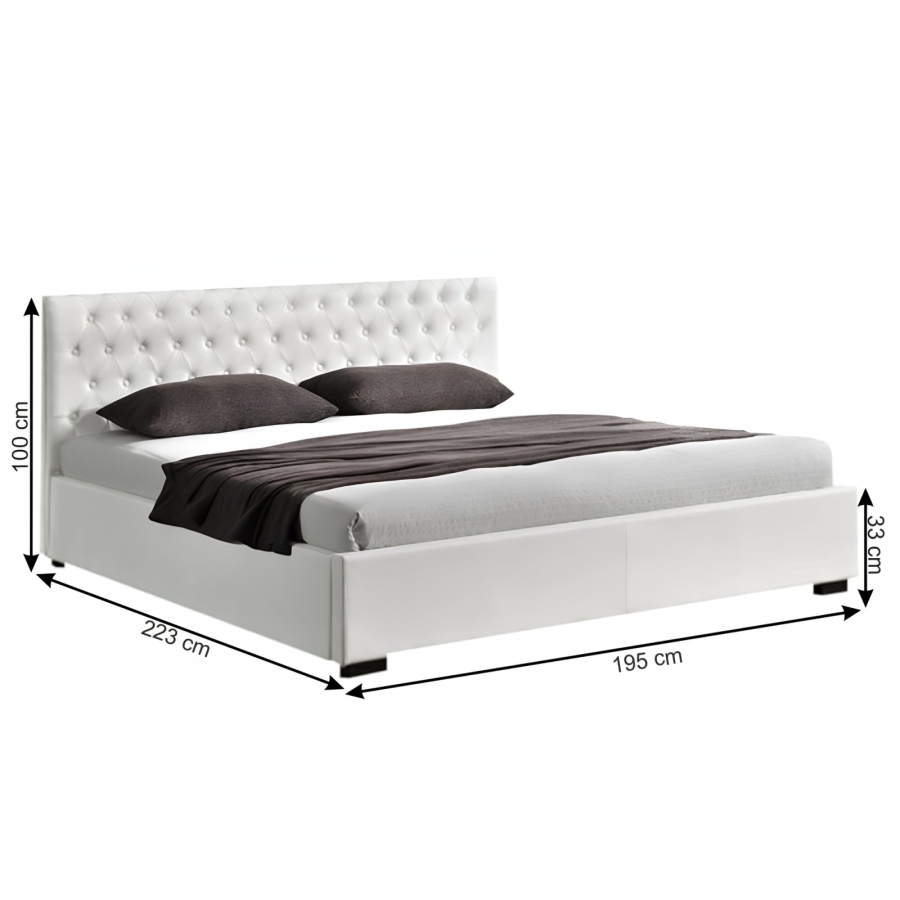 Ágy DORLEN 2 NEW steppelt támlával, rakodótérrel és lamellás ágyráccsal. Fehér textilbőr színben. A szövet kopásállósága: 100 000 Martindale Mérete (SzéxMéxMa): 195x223x100 cm Fekvőfelület (SzéxHo): 183x200 cm Terhelhetőség: 110 kg Az ágyhoz ajánljuk a 183x200 cm méretű matrac vásárlását. Lapraszerelten szállítva, matrac nélkül.
