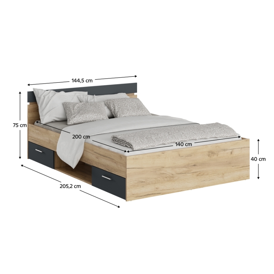 Anyaga: DTD laminált Színe: tölgy artisan/grafit Méretek (SzéxMéxMa): 144,5x205,2x75 cm Fekvőfelület mérete: 140x200 cm Az ágy teherbírása: 2x100 kg Alvási magasság: 40 cm Az ágykeret magassága matrac nélkül: 26 cm Matrac magassága: 15 cm Mindkét fiók azonos méretű Kétfiókos Ágyneműtartóval Fiókok mindkét oldalról szerelhetők Hozzárendelhető matrac és ágyrács Fix keretben lévő rács külön vásárolható Lapraszerelten szállítva