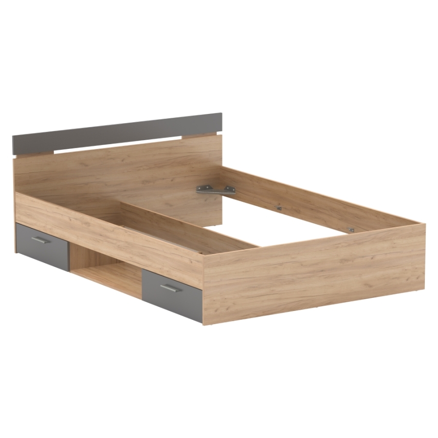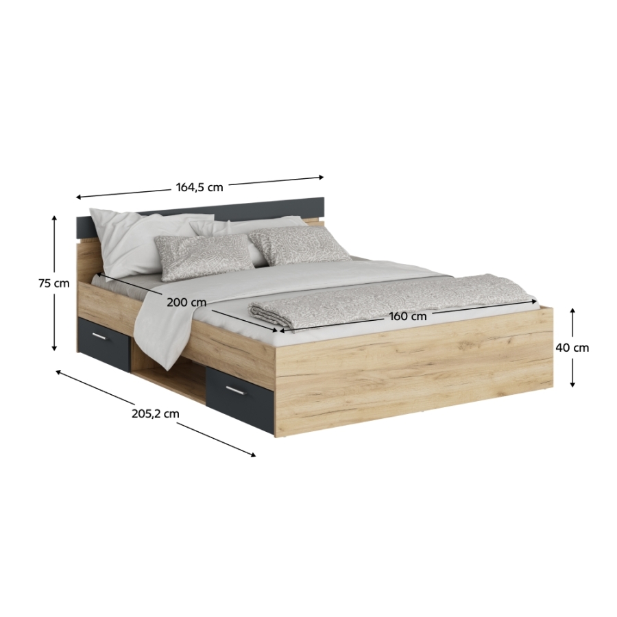 Anyaga: laminált DTD Színe: artisan tölgy/grafit Méretek (SzéxMéxMa): 164,5x205,2x75 cm Fekvőfelület mérete: 160x200 cm Az ágy teherbírása: 110 kg Alvási magasság: 40 cm Az ágykeret magassága matrac nélkül: 26 cm Matrac magassága: 15 cm Kétfiókos Ágyneműtartóval Fiókok mindkét oldalról szerelhetők Hozzárendelhető matrac és ágyrács Fix keretben lévő rács külön vásárolható Lapraszerelten szállítva