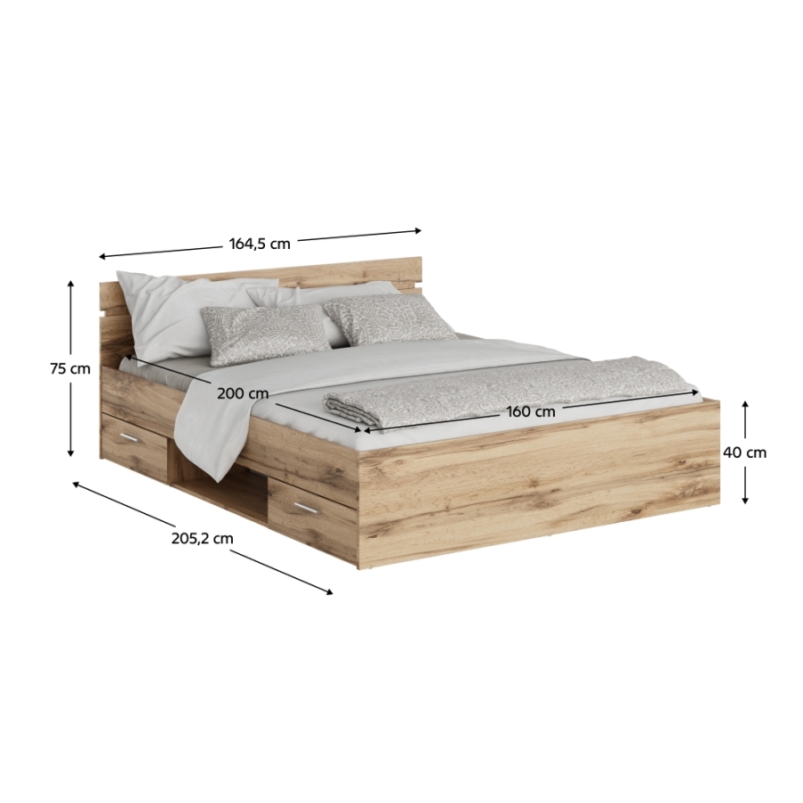 Anyaga: laminált DTD Színe: wotan tölgy Méretek (SzéxMéxMa): 164,5x205,2x75 cm Fekvőfelület mérete: 160x200 cm Az ágy teherbírása: 110 kg Alvási magasság: 40 cm Az ágykeret magassága matrac nélkül: 26 cm Matrac magassága: 15 cm Kétfiókos Ágyneműtartóval Fiókok mindkét oldalról szerelhetők Hozzárendelhető matrac és ágyrács Fix keretben lévő rács külön vásárolható Lapraszerelten szállítva