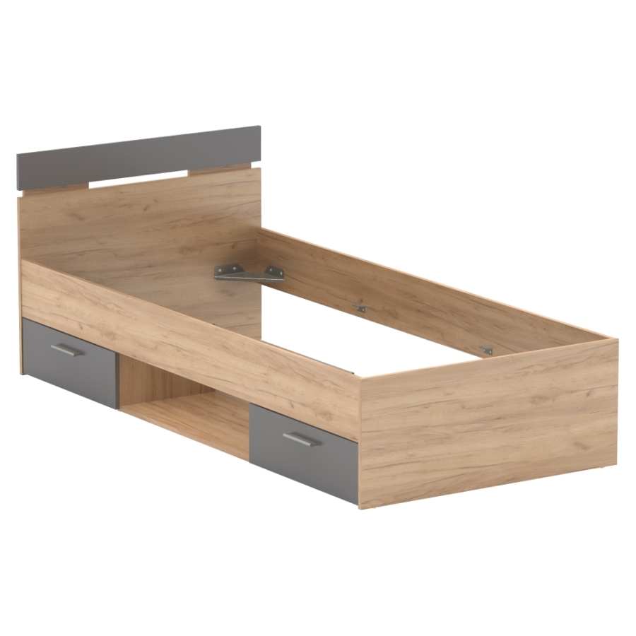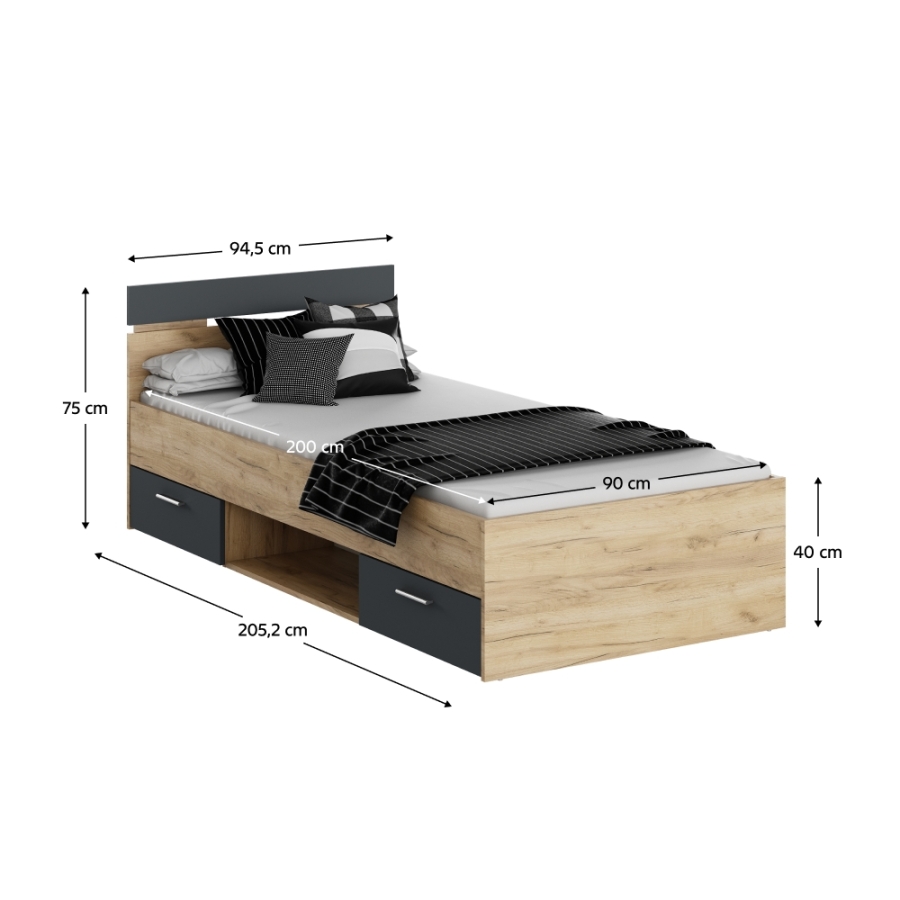 Anyaga: laminált DTD Színe: artisan tölgy/grafit Méretek (SzéxMéxMa): 94,5x205,2x75 cm Fiók méretei (SzéxMéxMa): 55,5x33,5x11 cm Fekvőfelület mérete: 90x200 cm Az ágy teherbírása: 100 kg Alvási magasság: 40 cm Az ágykeret magassága matrac nélkül: 26 cm Matrac magassága: 15 cm Kétfiókos Ágyneműtartóval Fiókok mindkét oldalról szerelhetők Hozzárendelhető matrac és ágyrács Fix keretben lévő rács külön vásárolható Lapraszerelten szállítva