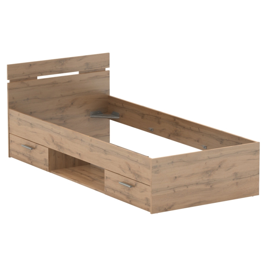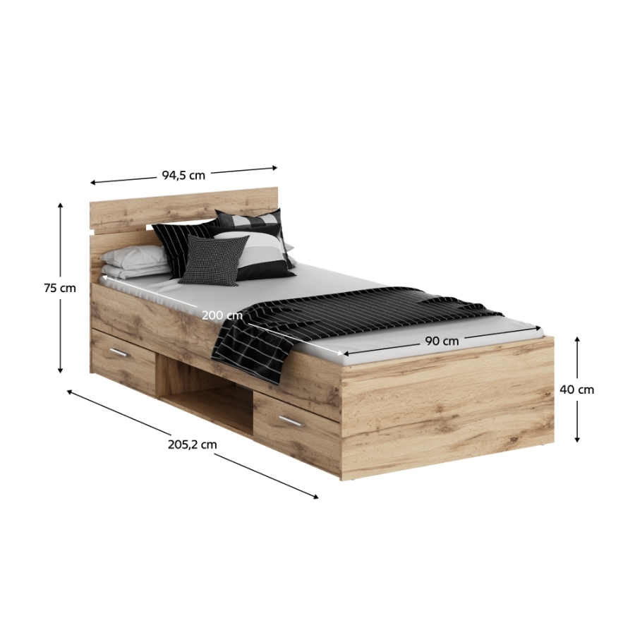 Anyaga: laminált DTD Színe: wotan tölgy Méretek (SzéxMéxMa): 94,5x205,2x75 cm Fiók méretei (SzéxMéxMa): 55,5x33,5x11 cm Fekvőfelület mérete: 90x200 cm Az ágy teherbírása: 100 kg Alvási magasság: 40 cm Az ágykeret magassága matrac nélkül: 26 cm Matrac magassága: 15 cm Kétfiókos Ágyneműtartóval Fiókok mindkét oldalról szerelhetők Hozzárendelhető matrac és ágyrács Fix keretben lévő rács külön vásárolható Lapraszerelten szállítva